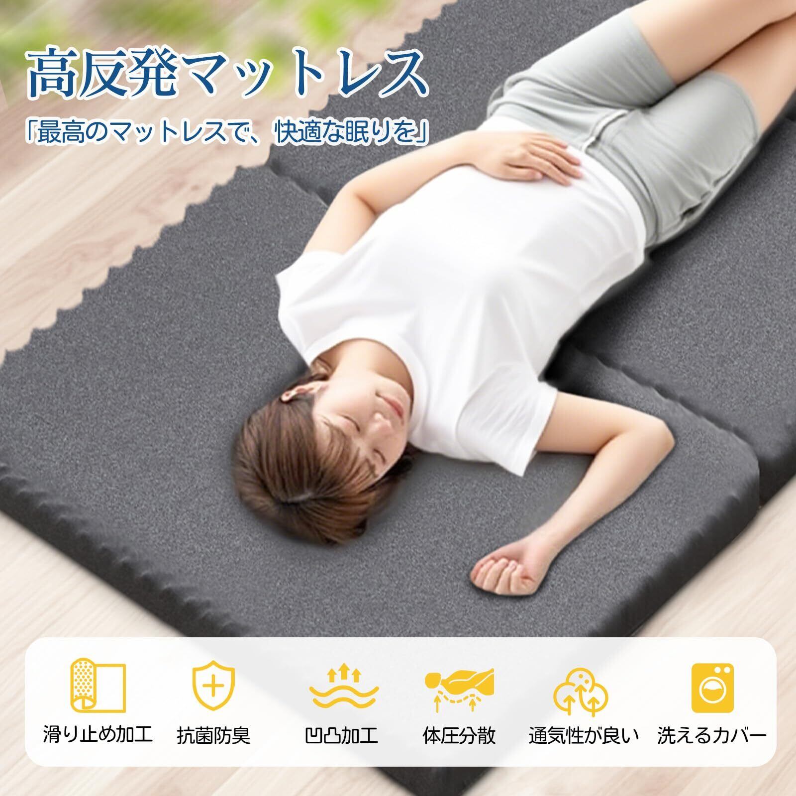 【滑り止めデザイン・収納簡単・多用途】三つ折りマットレスの底部には滑り止めデザインので、マットレスとゆかの間の摩擦が増加し、使用中にマットレスが動くのを防ぎます。使わない時にコンパクトに収納でき、軽量なので誰でも簡単に持ち運べます。敷布団として床やベッドに使えるほか、ロフトやソファー、来客用にも様々なシーンで大活躍です。ご注意:コンパクトな梱包のため、開封時に折りシワや変形がある場合がありますが、一週間ほどで元に戻ります。ウレタンのにおいが気になる場合は、風通しの良い場所で陰干ししてください