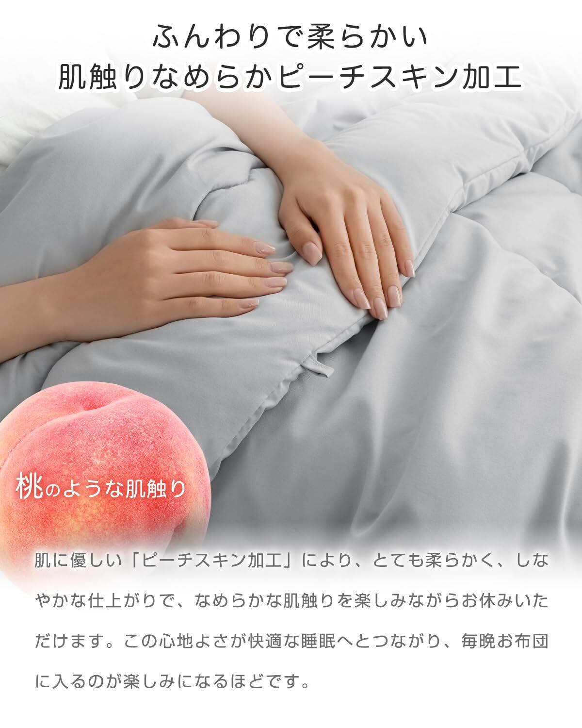 【ふんわり・柔らかい】肌に優しい「ピーチスキン加工」で、とても柔らかく、しなやかに仕上がっており、寝ているときも身体が包み込まれているような感覚を味わえます。