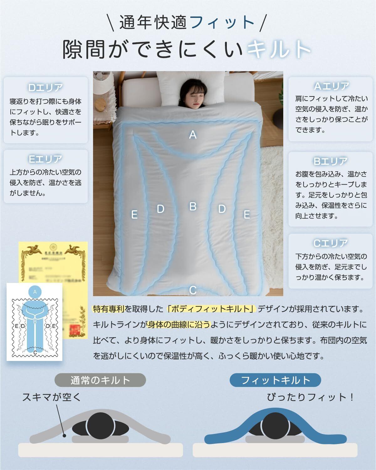 【体にフィットするキルト】人間工学に基づいたキルトデザインで、従来のキルトよりもさらに身体にしっかりフィット!寝返りしてもズレにくく、ぴったりとフィットするため、暖かさをしっかりキープします。