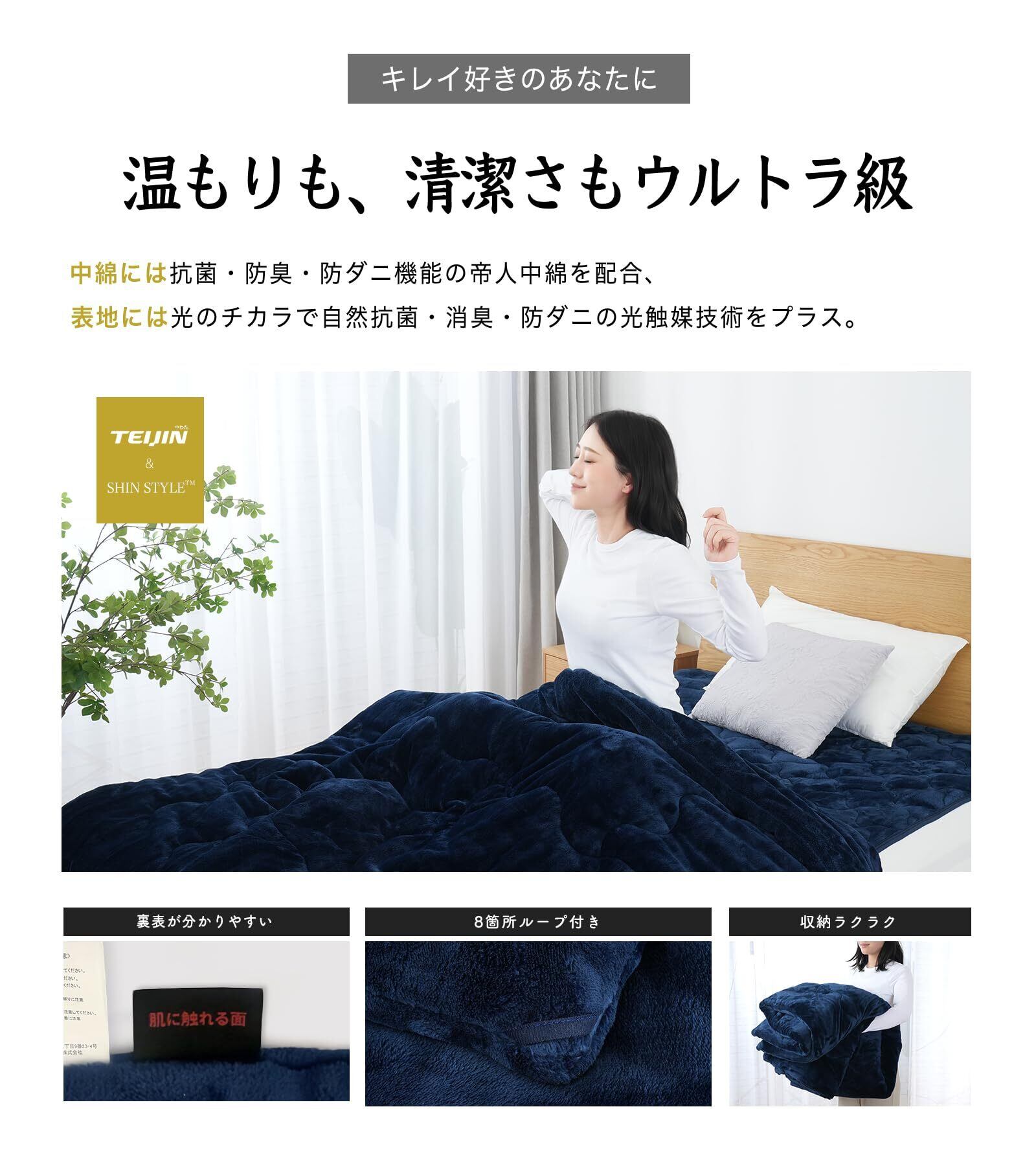 【「シルク」よりなめらか×CICA配合の美肌睡眠冬用厚手毛布布団】①マイクロファイバーの中でも最上級、シルクより細かい超極細繊維をたっぷり使用。まるでカシミアのようにとろける肌触りで、体温をしっかりキャッチし、ぽかぽかと包み込みます。②さらに、美肌ケア成分も贅沢に配合。韓国美容で話題の「CICA(肌荒れ防止予防成分)」を配合し、睡眠中の乾燥肌から肌を守ります。寒い冬の夜は、もこもこで暖かな毛布かけ布団をぎゅっと抱きしめて、心も肌も満たされるぬくもりをご体験ください。