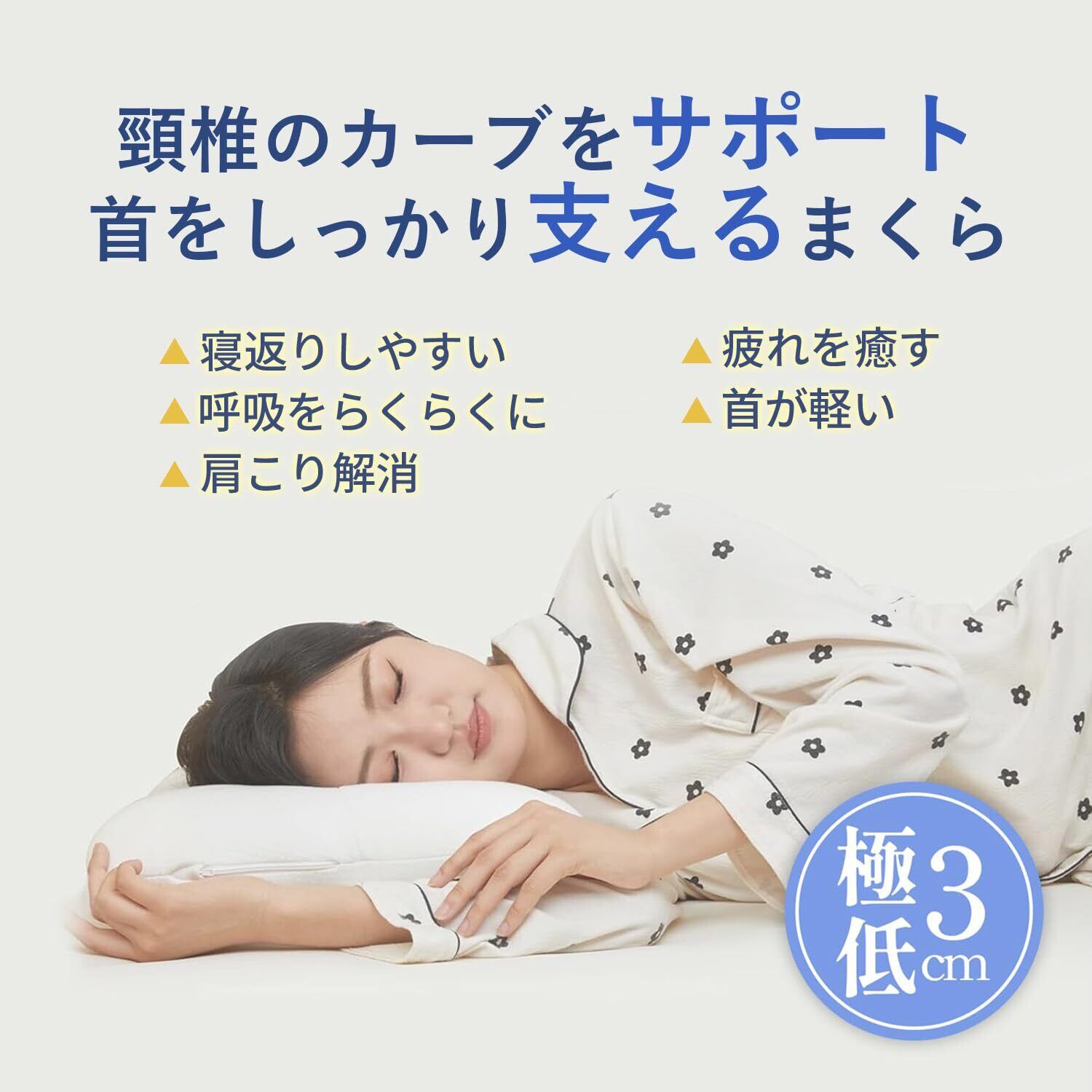 【極めた低さと独自のカーブ設計】頭をのせるとたった 3cm の高さになる 低い枕 です。 首と肩にフィットする独自のカーブ設計で、首や肩の負担を減らし、寝返りや呼吸はスムーズにできます。 首が痛くならない まくら を実現するための 低め の 枕です。
