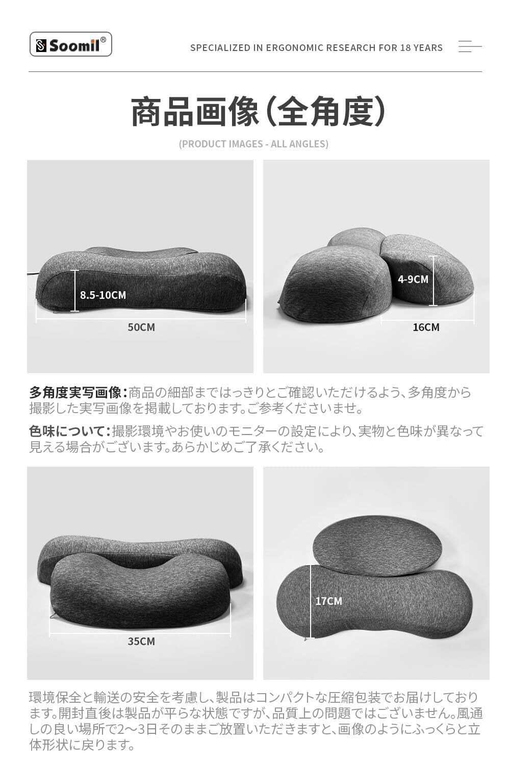 【商品詳細】 枕(枕カバー付属・洗濯可)、取扱説明書、精美なギフトボックス 本体サイズ:幅50cm × 奥行34.5cm × 高さ10.5cm 重量:0.88kg 【各部のサイズ】 ·頭枕部:幅35cm × 奥行16cm × 高さ4~9cm ·首枕部:幅50cm × 奥行17cm × 高さ8.5~10cm *ご注意:ご購入の前に必ず商品のサイズやカラーなどの詳細をよく確認してからご注文ください。