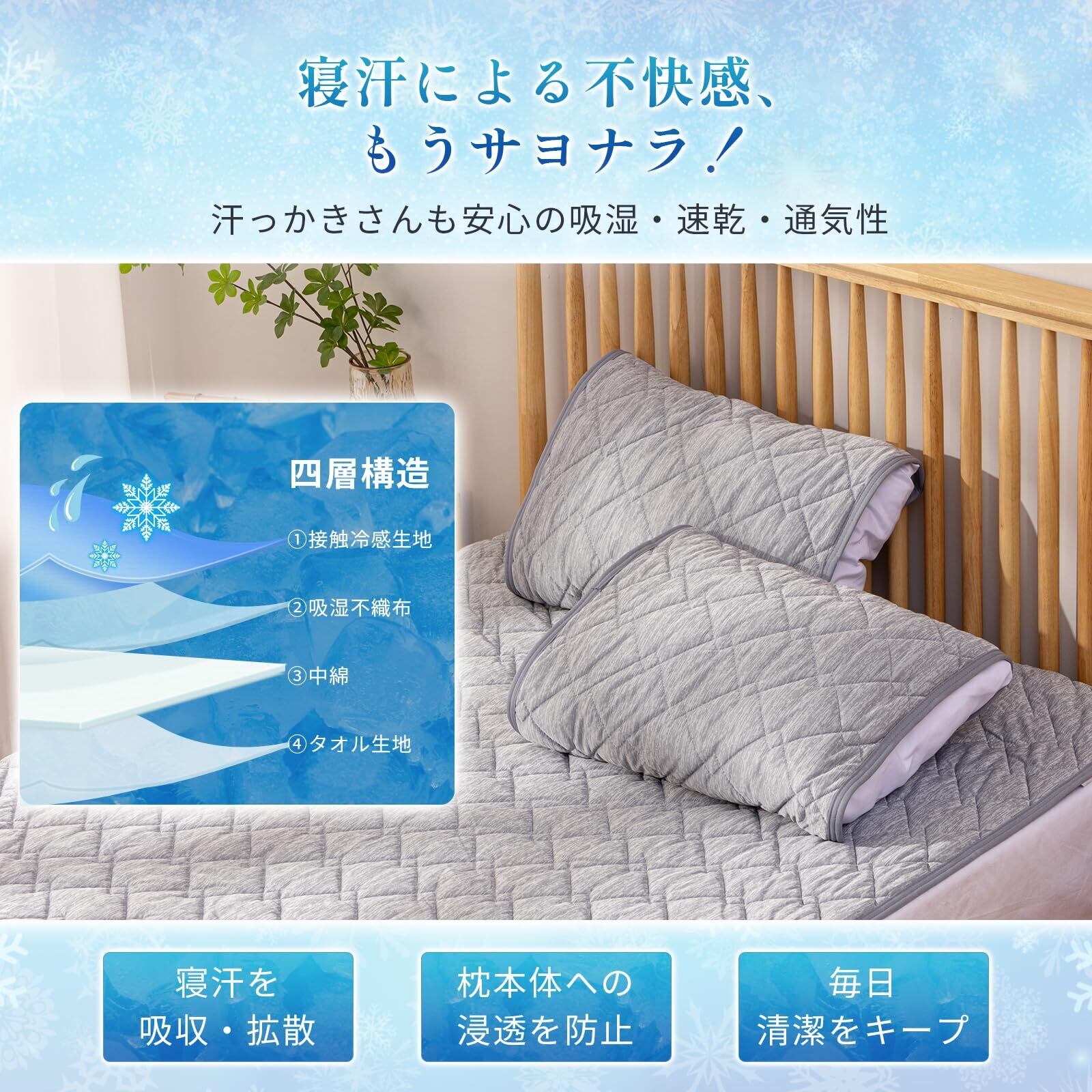 【強力な吸湿速乾性能、寝汗対策】多層構造により、汗を素早く吸収して蒸発させることができます。寝汗による「あせもや肌荒れ」「頭皮のかゆみやニオイ」の発生を防ぎ、快適な睡眠環境を提供します。