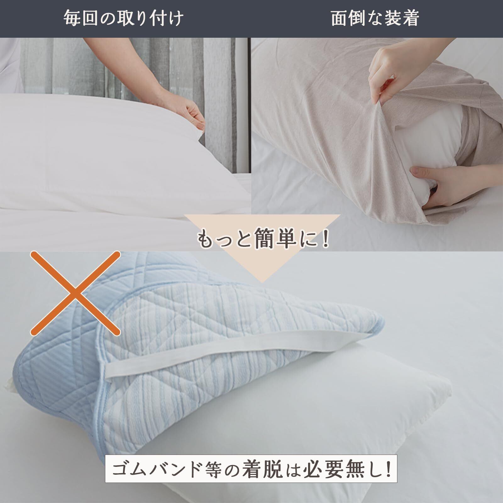 【置くだけでズレない!ゴムなし枕パッド】背面部分に滑り止めが付いているので、枕にサッと置くだけでピタッとフィットします。寝返りをうってもズレにくく、朝までぐっすり快適な眠りをサポート。手間なく簡単に使えるので、家事の負担を減らしたい方におすすめです。