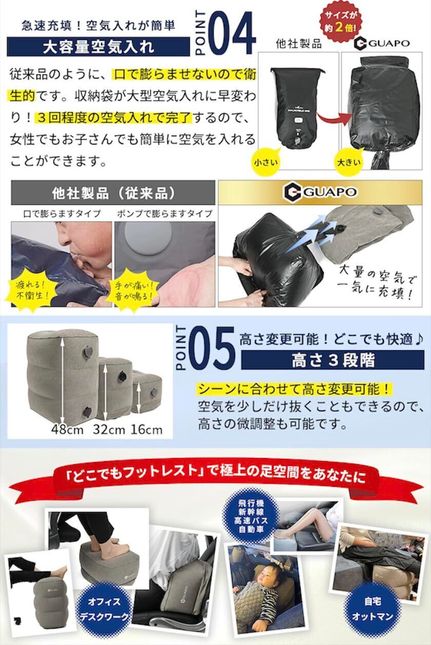 【シーンに応じて高さ調整可能】1段〜2段〜3段の高さ調節が可能で、エアー式の設計なので、空気量を調整して様々な場所にフィットさせることができ、硬さも個人の好みに合わせて調節可能です。 ■■【パッケージ内容】フットレスト(3in1収納袋付き)、取扱説明書兼書 ■■【 空気漏れ付き 】 商品がお手元に届きましたら、一度空気を入れていただき空気漏れがないか確認をお願いしております。万が一、空気漏れが確認できた場合は無償で新品と交換させていただきますのでご安心ください。 ■■ 注意事項:飛行機や新幹線などで乗り物で使用する場合は、各管理会社の指示に従って使用してください。安全のための注意事項があります。