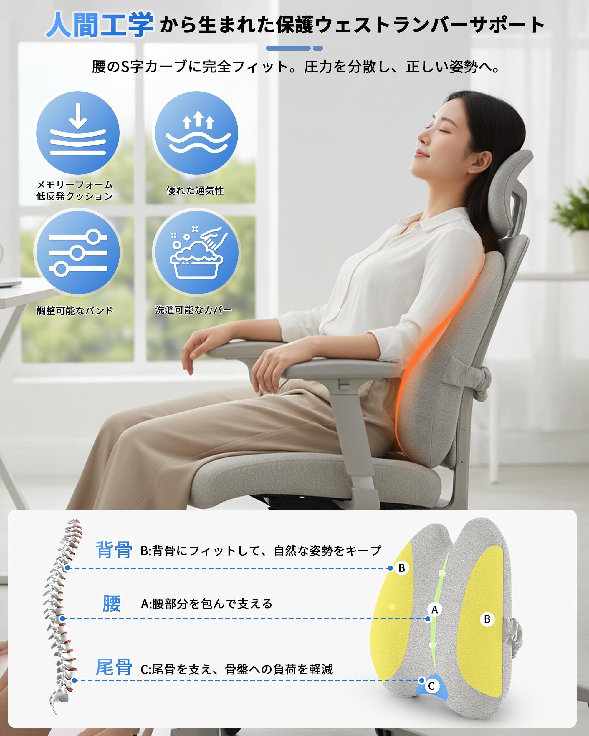 【体圧分散設計で 尾骨まで楽に】腰を支えるだけでなく、座った時に生じる尾骨周辺の圧力も広く分散。腰からお尻にかけての負担を和らげ、よりリラックスした状態で座り続けることができます。椅子と腰部の隙間を効果的に埋めることで、猫背を防ぎ、自然に背筋が伸びる健康的な姿勢をキープします。