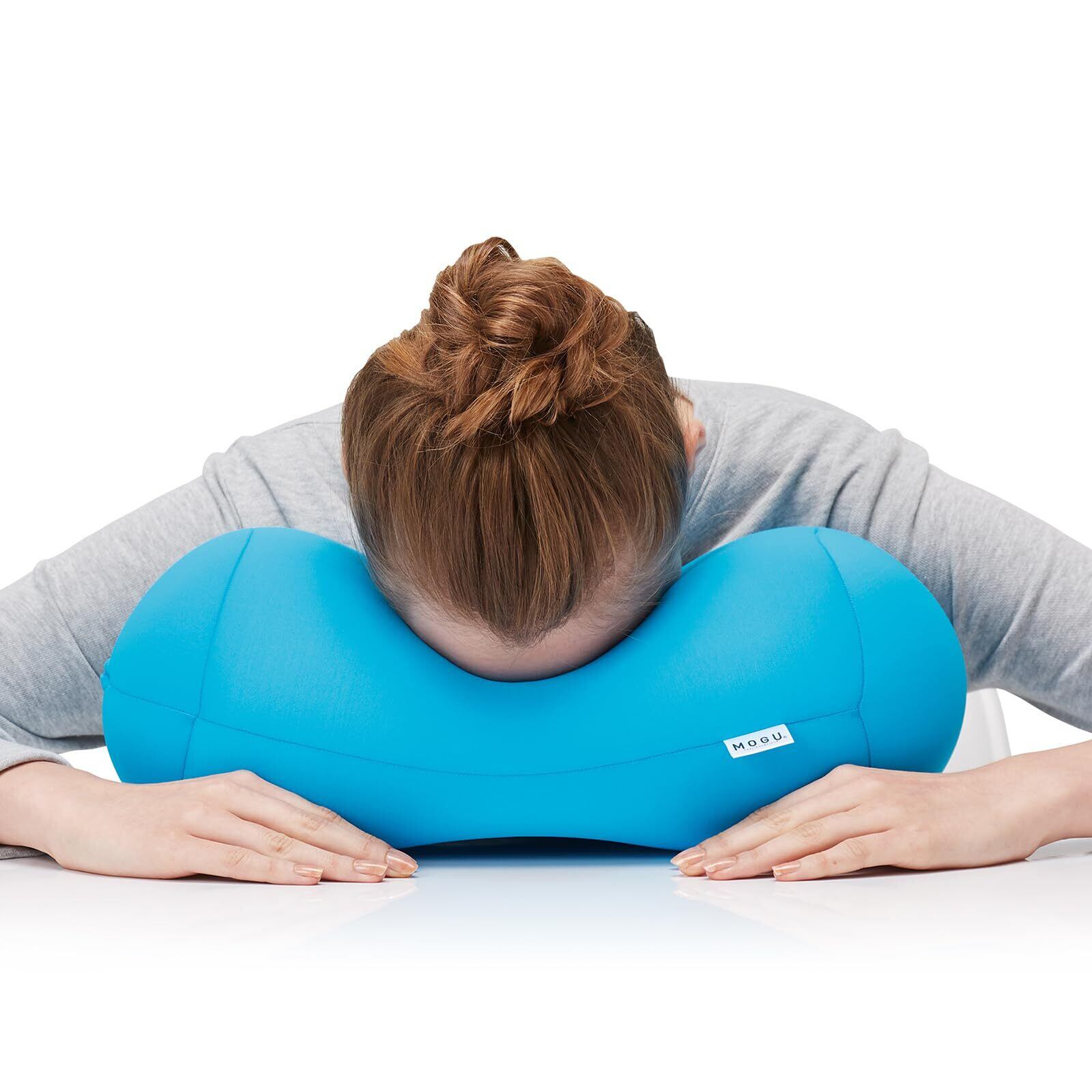 体に寄り添う「ホールピロー」;穴をあけることで、まくらに緩やかなカーブが生まれ、体の凹凸にぴったりフィット。MOGU独自の超微粒子ビーズが頭や腰、お尻を心地よく支えます。