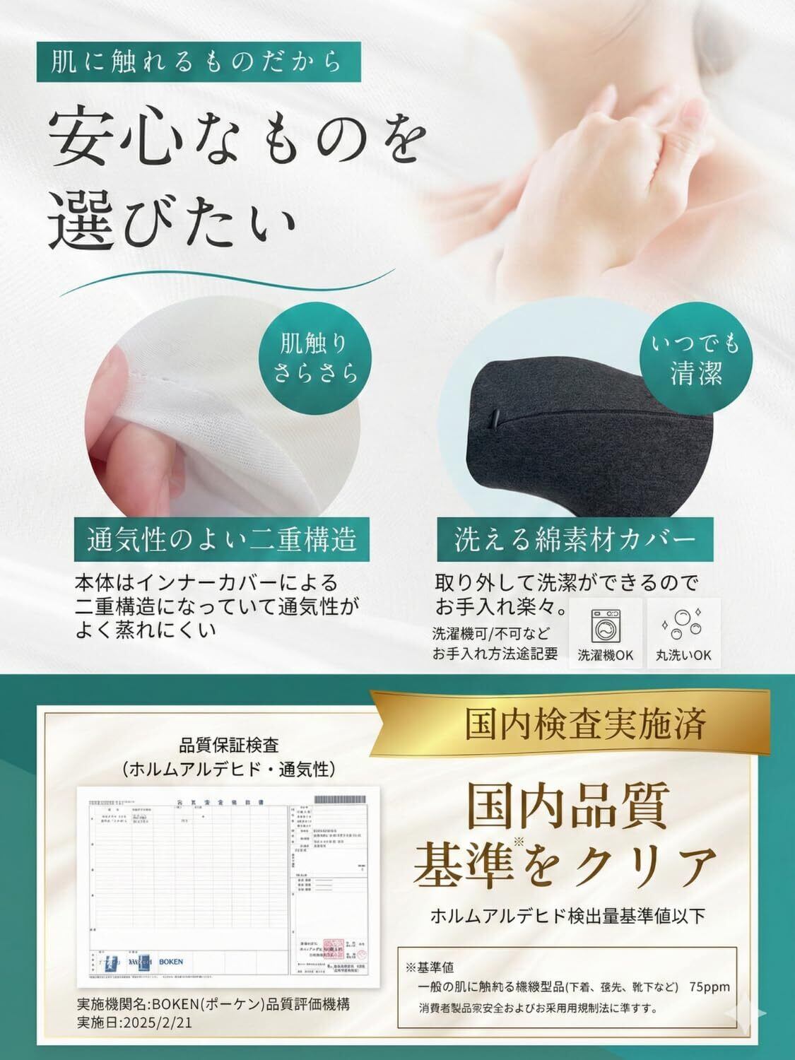 【日本国内検査機関による品質検査】 当製品はJIS L1041に基づき、遊離ホルムアルデヒドの検査を受けており、20mg/kg以下という基準値をクリアしています。この検査結果により、使用者はホルムアルデヒドによる健康リスクを心配する必要がなく、安心してお使いいただけます。肌に触れる製品だからこそ、品質には徹底したこだわりを持っており、安全性が確保された製品です。 【洗濯可能な本体カバー】は、JIS-L-1096 A法による通気性の検査を実施しており、38.2 m³/(m²・s)という結果を記録。 一般的な枕カバーの通気性が15~30 m³/(m²・s)であるのに対し、本製品は優れた通気性能を示しています。 この高い通気性により蒸れにくく、常に清潔で心地よい使用感を提供します。