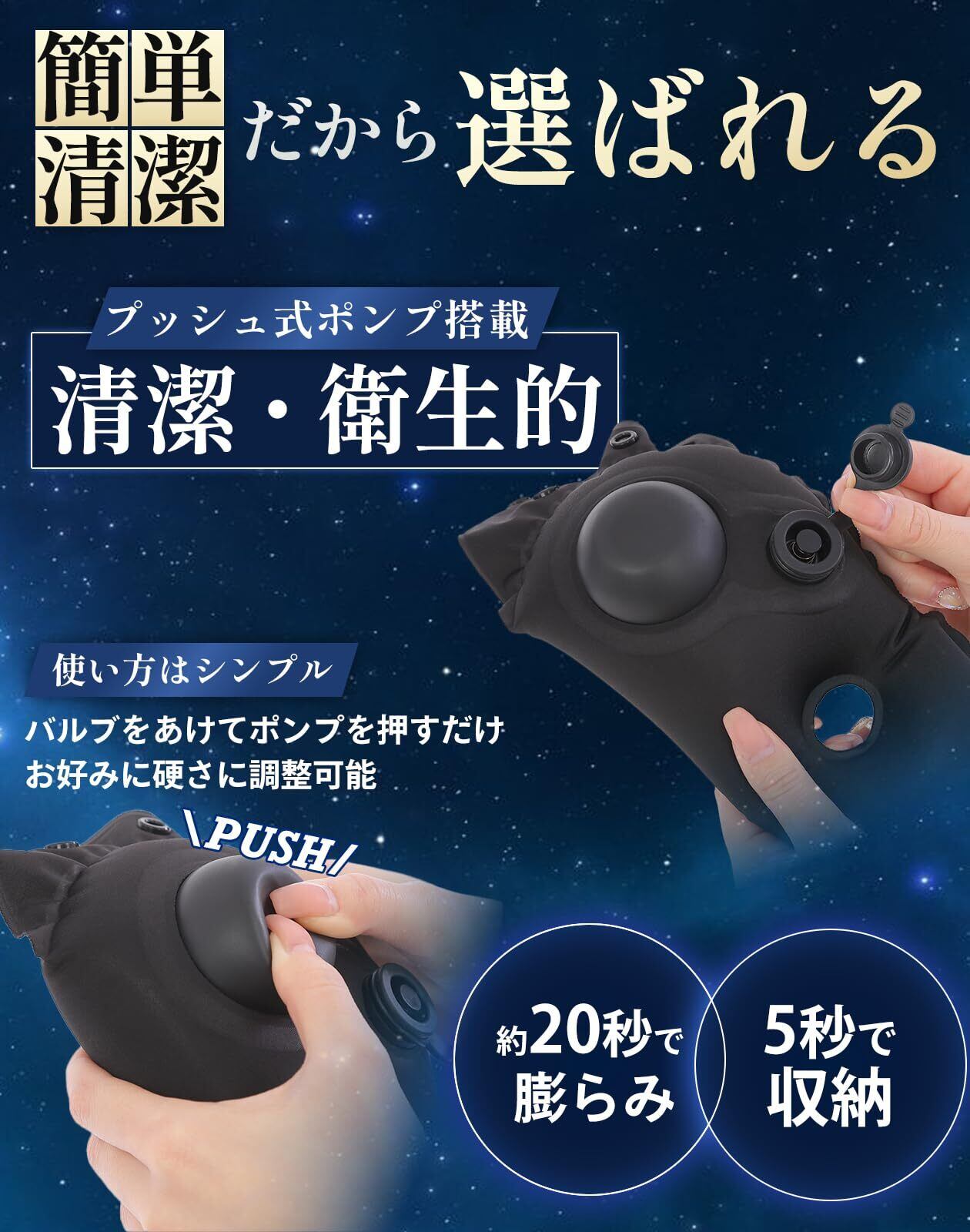 【エアーポン式で硬さ調整は自由自在】ポンプ式を採用したエアーネックピロー。口をつけずに膨らますから感染リスクや衛生的にも安心で常に清潔にご使用いただけます。さらに、約20~30秒押すだけで理想のまくらに大変身、空気の量を調整すれば好みの硬さにできるので男女問わずご使用いただけます