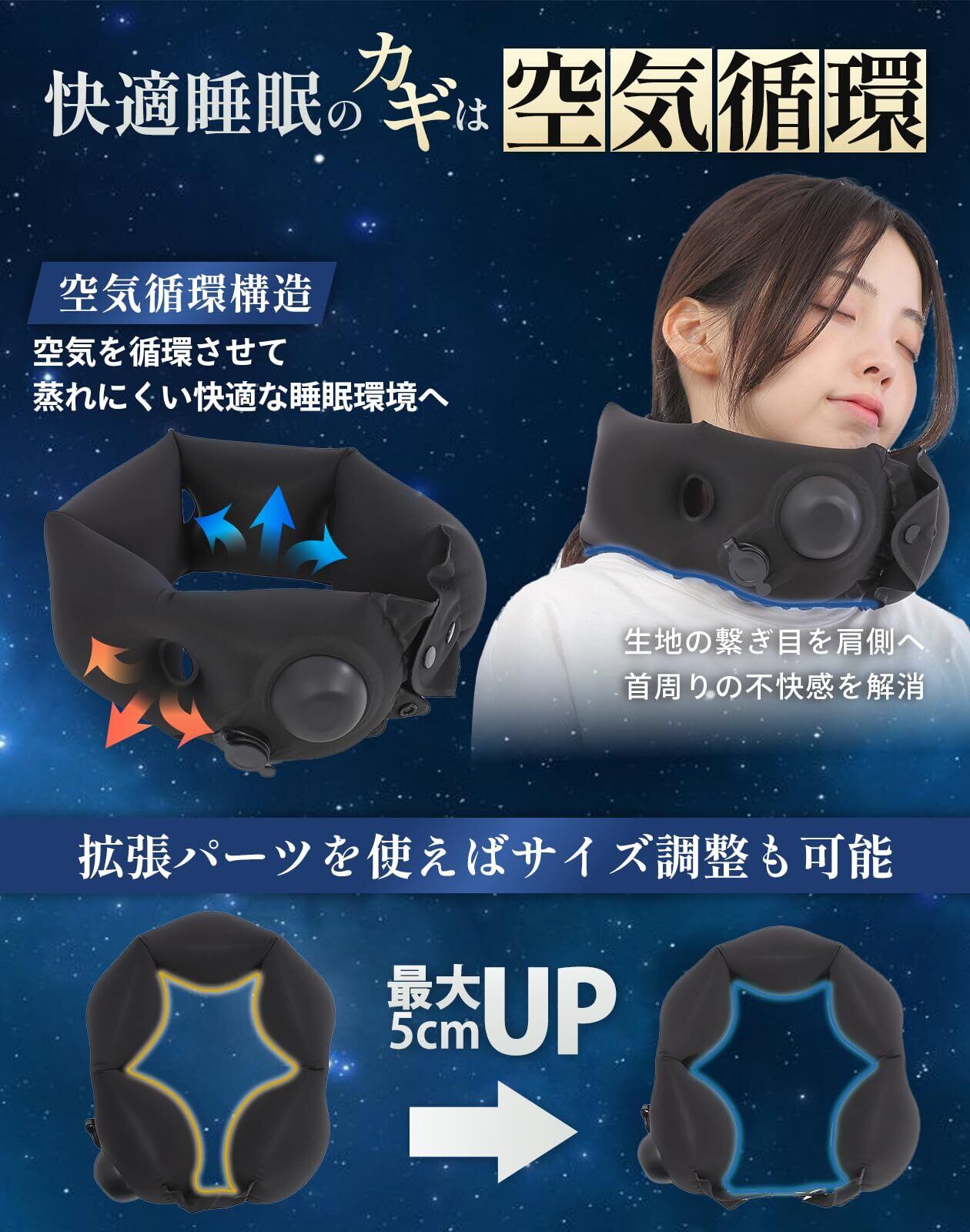 【人間工学に基づいた3D設計で首をしっかりサポート】人間工学に基づいた3D設計で5つのクッションが首を包み込むようにしっかりサポート。抜群の安定感と包み込むホールド感のあるネッククッション。いつでもどこでも快適に睡眠ができる。さらに付属の拡張パーツを使用すれば最大の5cm拡張が可能。首周りが太い方はもちろん、お好みのサイズに調整ができるコンパクトネックピロー