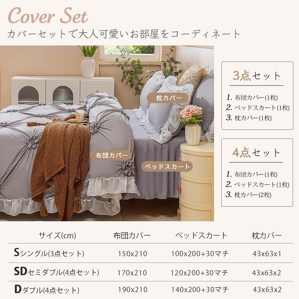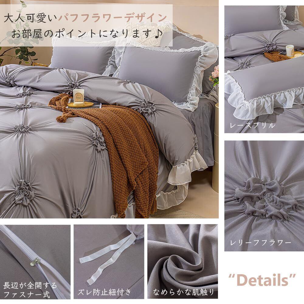 布団カバー 寝具カバーセット 布団カバーセットふとんカバー 【パフフラワーデザイン】姫風 可愛い ベッドスカート 掛け布団カバー シングル 3点セット セミダブル ダブル4点セット枕カバー フリル付きおしゃれ 肌に優しい洋式・和式兼用 北欧風 オールシーズン 丸洗い お手入れ簡単 (グレー, セミダブル-4点セット)