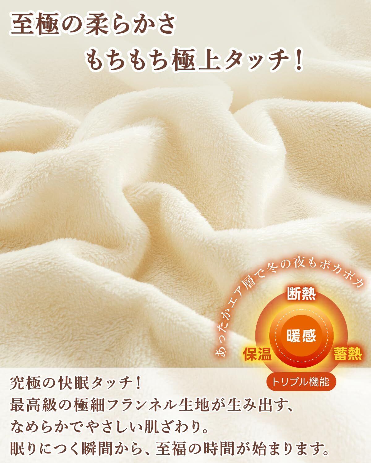 【極上のふわふわ感と優れた保温性】 高密度フランネル生地を採用した、軽やかなのに温かさをしっかりキープする掛け布団カバーです。 極細繊維の緻密な構造が暖かい空気を効率的に閉じ込め、外気の冷たさを遮断します。 繊維の一つひとつの間に形成される空気層が断熱効果を高めているため、体温を逃がしません。 ふんわりとした肌触りと保温性を両立し、寒い季節の快適な睡眠をサポートします。 冬の夜も「ぬくぬく」とした暖かさに包まれる、季節限定の癒しアイテムです。