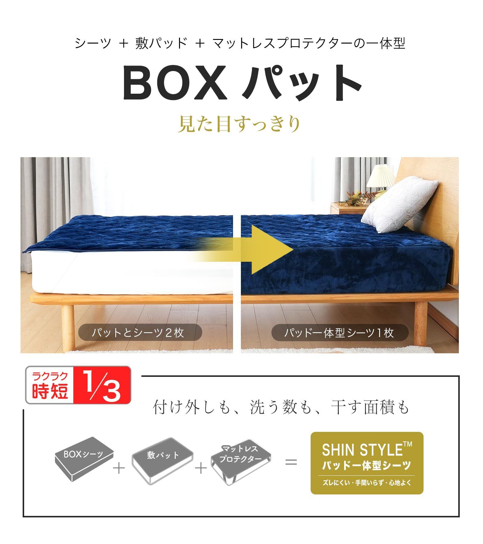 【時短&パッド一体型ボックスシーツ 冬 新仕様】シーツ+敷きパッド+マットレスカバーの一体型なので、取り替えも洗濯も干すもこれ一枚で完了するので洗濯の回数も減り、ラクラク。さらに、ボックスシーツタイプなので、裏面まで包み込んでフィットするのでずれにくい。厚さ30cmまで使用できるので、マットレスだけでなく、敷ふとんや敷ふとんとマットレスの重ね使いにもOK。 7層構造 洗える「サイズ」セミダブル:120×200×30cm ※キルティング製(許容範囲+5%,-3%)【ゴムバンド付き】 圧縮包装 別名:アエロゲル敷きパッド/グラフェン敷きパッド/敷きパッド一体型ボックスシーツ 冬用
