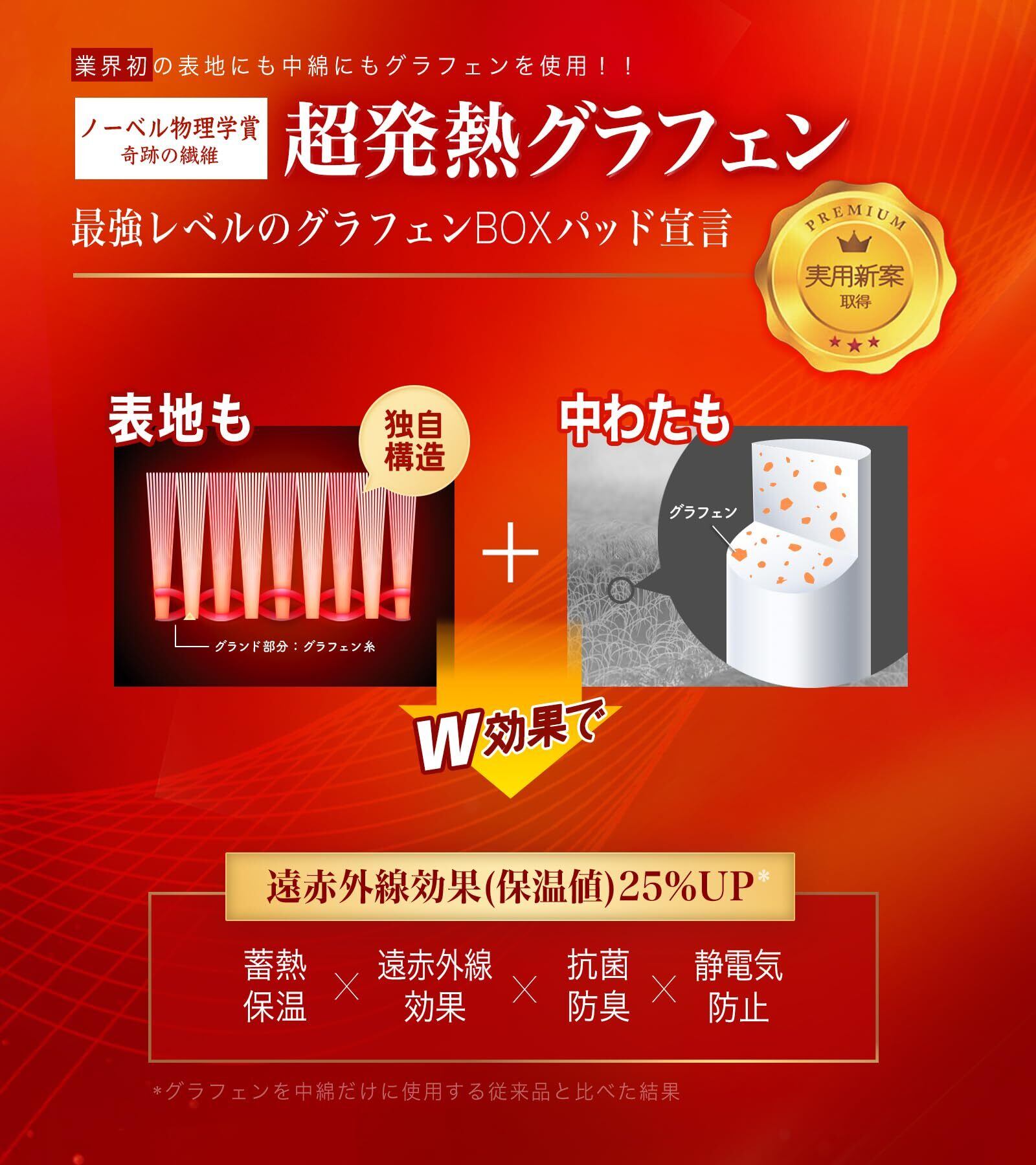 【実用新案取得&業界初のWグラフェン×エアロゲル 7層超発熱冬用敷きパッド一体型ボックスシーツ】厚さわずか2mmで-196℃を断熱する宇宙服素材「エアロゲル」、ノーベル賞受賞素材の「グラフェン」、そして先端技術による吸湿発熱素材「アクリレート」。この3大先端素材を独自技術で黄金比率に組み合わせ、冬の寒さを快適に乗り越える次世代の超断熱パッド一体型ボックスシーツを開発しました。さらに誇るべきは、その技術力。「グラフェン」は銅の10倍という世界最高熱伝導率を持ち、2024年には暖かい敷きパッド用中綿素材として大ヒット。そして2025年、さらなる暖かさと快適な寝心地を追求し、糸自体に発熱機能を持たせる独自の紡績技術を開発。これにより、業界初(実用新案)となる「生地のグランド部分」にもグラフィンを配合し、Wグラフェン超発熱仕様へと進化を遂げました。ぜひこの【超機能】あったかボックスシーツを体験してください。