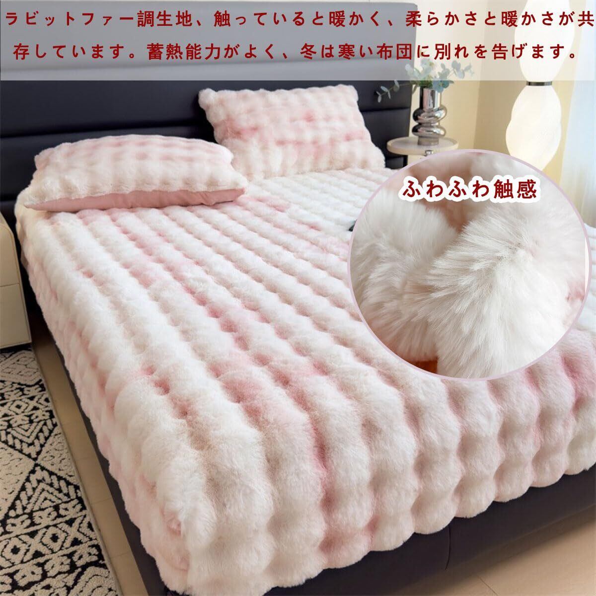 【ふわふわ触感】毛先の長い繊維を使用して、ふんわりとした感触が楽しめるラビットファー調ボックスシーツ。ラビットファー調生地のシーツは布団に入った瞬間ヒャッと感がなく、入った瞬間からすぐに暖かさを感じる事できます。蓄熱能力がよく、冬は寒い布団に別れを告げます。吸湿性もよく、肌をいたわり、寝そべって暖かく快適です。