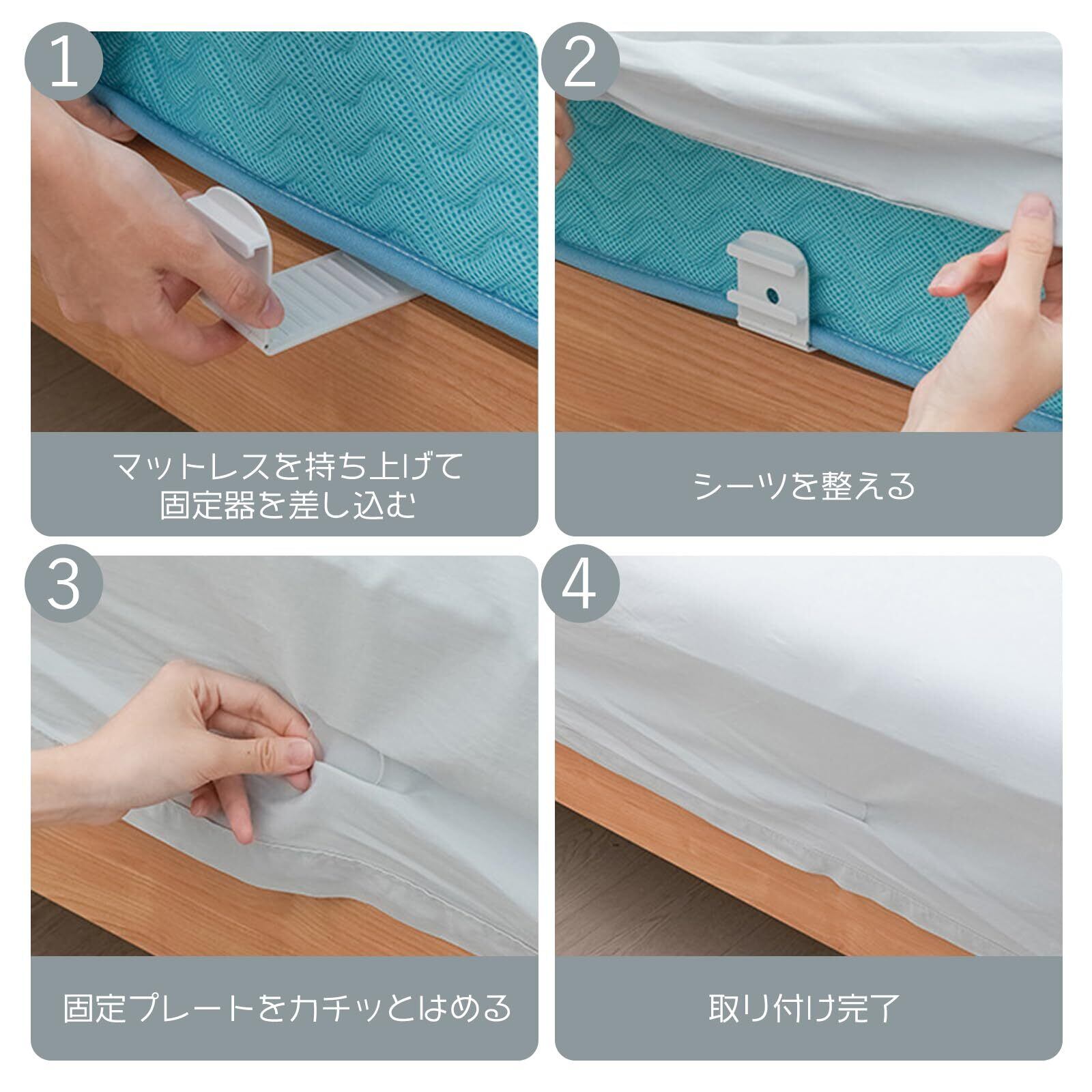 【簡単取り付け&工具不要】使い方はとても簡単で、マットレスの下に差し込み、シーツをクリップで挟むだけ。工具不要で、誰でも短時間で設置可能。毎日のベッドメイキングがぐっと楽になります