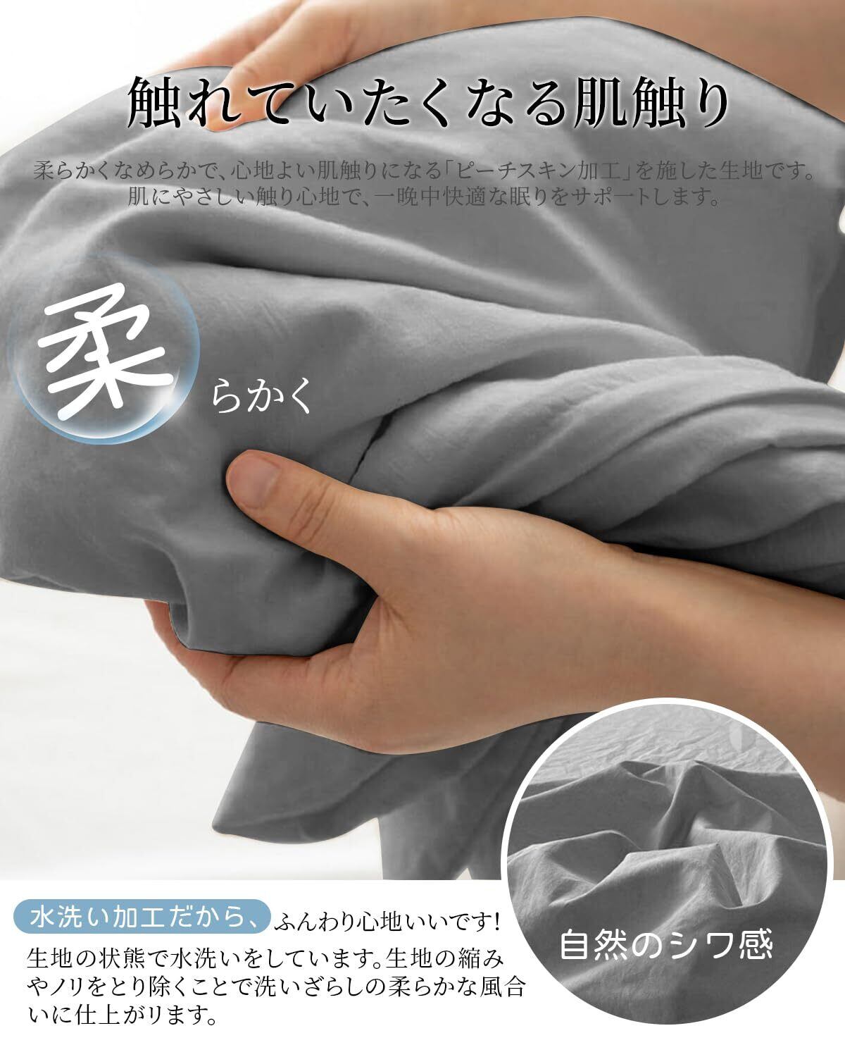 「洗いざらし&ピーチスキン加工」生地に洗いをかける技術でポリエステルなのにコットンのような柔らかな肌触りを持ちます。使い始めから極上の柔らかさを実現しました。さらに、ピーチスキン加工で、桃の皮の表面の様な生地ように、高級感があるのでフオーマルでもバッチリな生地になります。二回技術加工で、思わずうっとリしてしまいそう。每日、お布団に入るのが待ち遠しくなります。