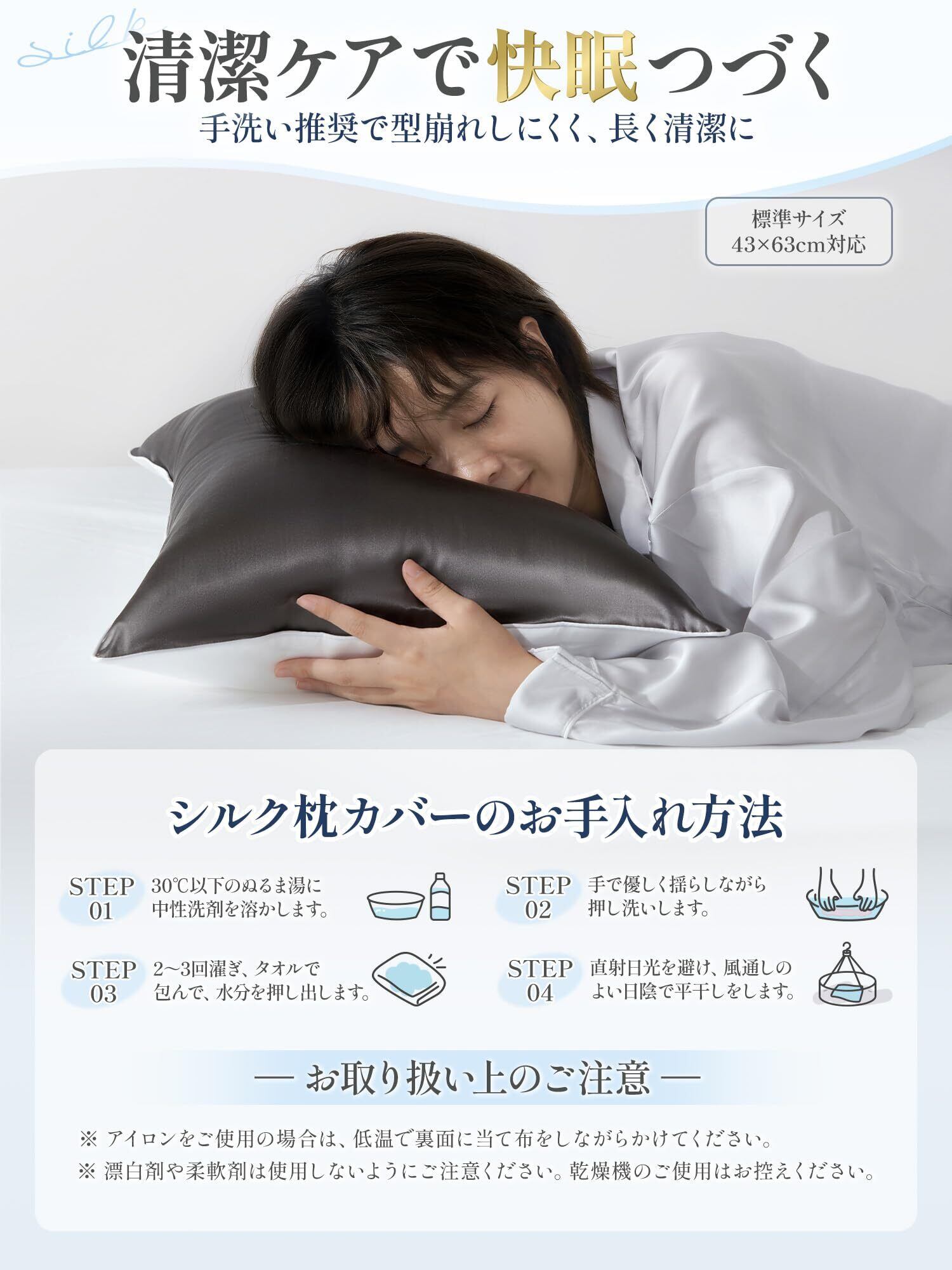 【シルク×リヨセルの贅沢仕様】片面には厳選された6Aランクシルク100%を使用。しっとり艶やかでなめらかな肌触りが、美髪・美肌を守りながら上質な眠りを導き、寝具に格別の高級感を演出。もう片面には環境にやさしい植物繊維(リヨセル)100%(一般に「テンセル」とも呼ばれる)を採用。優れた通気性と吸湿性でオールシーズン快適に、高い強度で型崩れを防ぎ、清潔さを長く保てる。