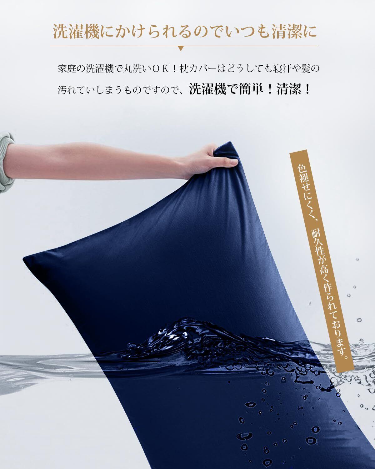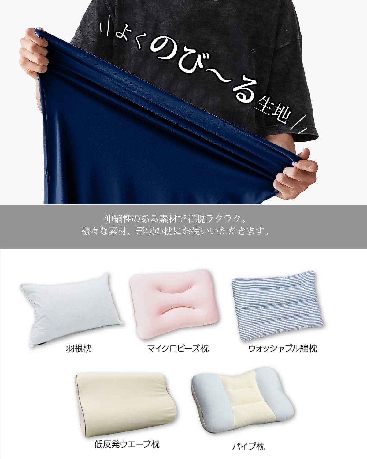 「のびのび~素材で」 このピローカバーはポリエステル95% +ポリウレタン 5%の素材を採用、まるで着慣れたTシャツのように肌に馴染む柔らかさ、やさしい触り心地が魅力です。高いストレッチ性のある生地で、汗をかいても素早く吸収速乾、100回洗濯しても丈夫な耐久性で、一年を通じて快適に使えます。