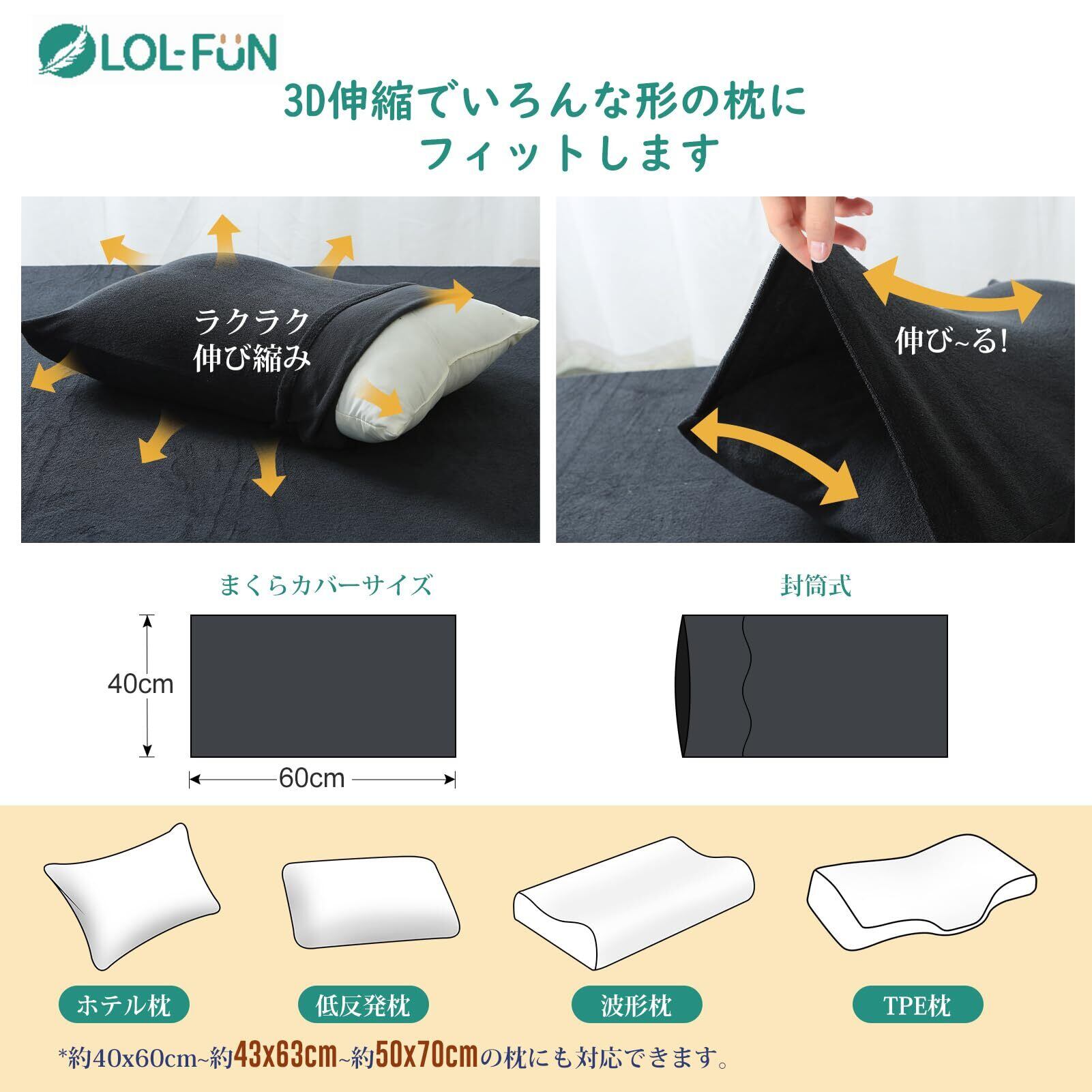 【LOL-FUN】枕カバーピロケース まくらカバー【高級綿100%・タオル地・高密度パイル・弾力UP・3D伸縮】 のびのび 封筒式 厚手 無地カラー ふわふわ 肌に優しい【抗菌防臭・ 部屋干し ・通気性】 オールシーズン四季用 いろな形枕にフィットします(黒, 43x63cm~50x70cm枕適用)