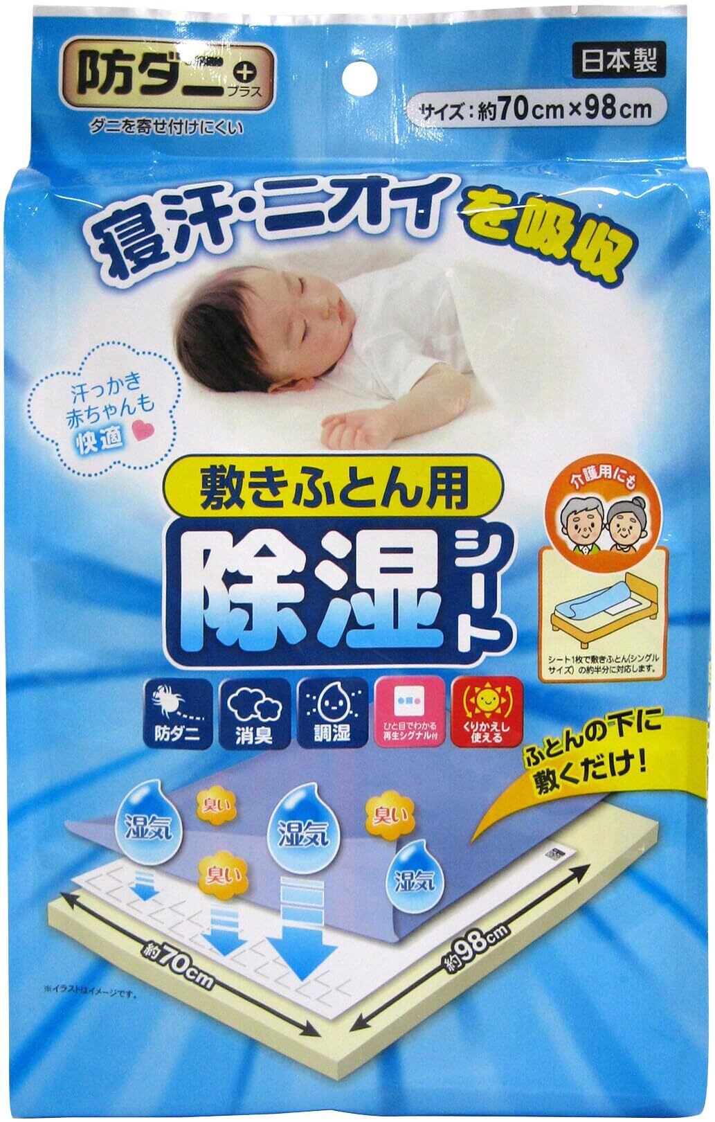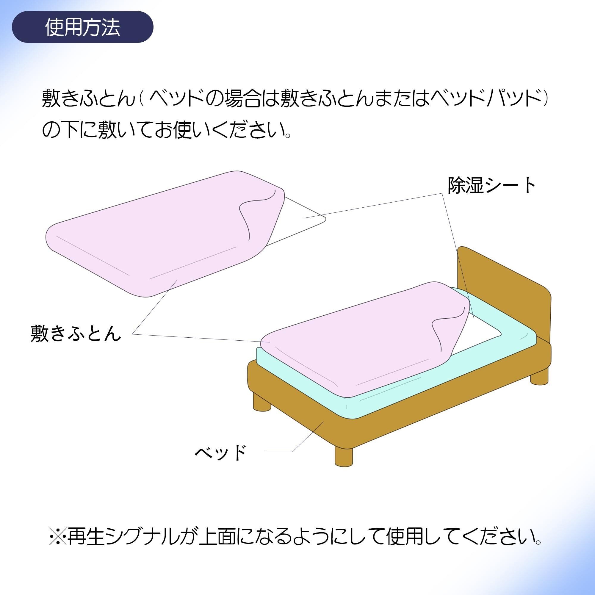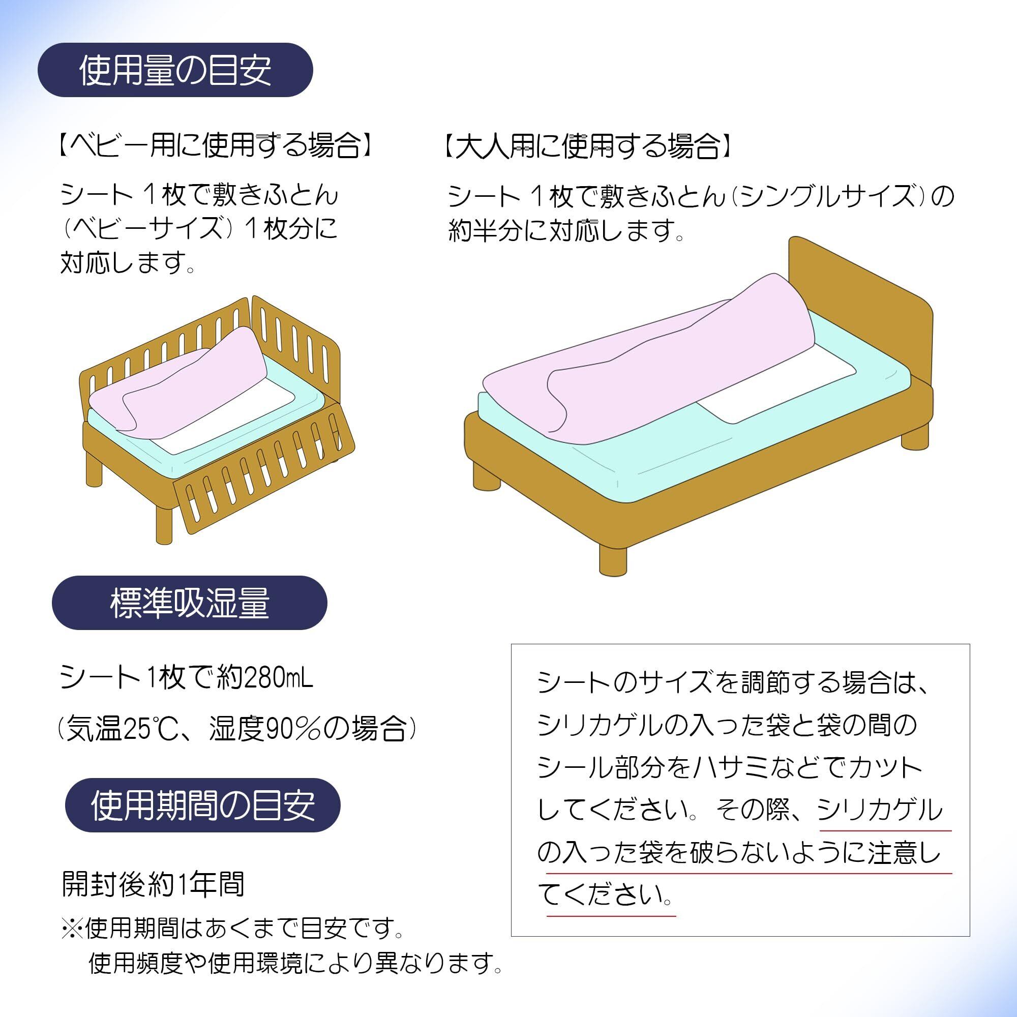 70x98cm。B型シリカゲルの吸湿特性により、敷きふとんの余分な湿気をすばやく吸湿します。不織布に防ダニ剤を加工しています。再生シグナル付、天日に干して繰り返し使えます。
