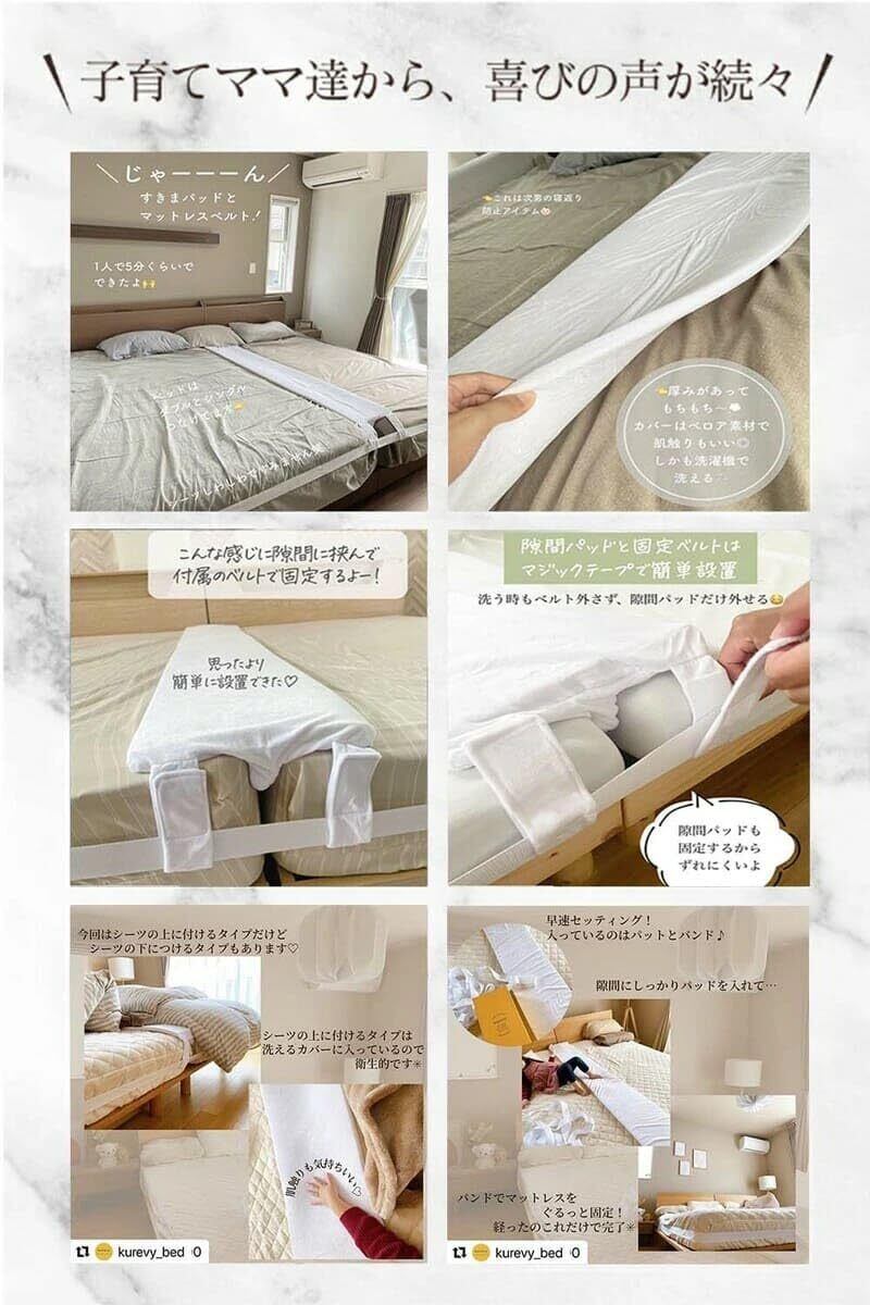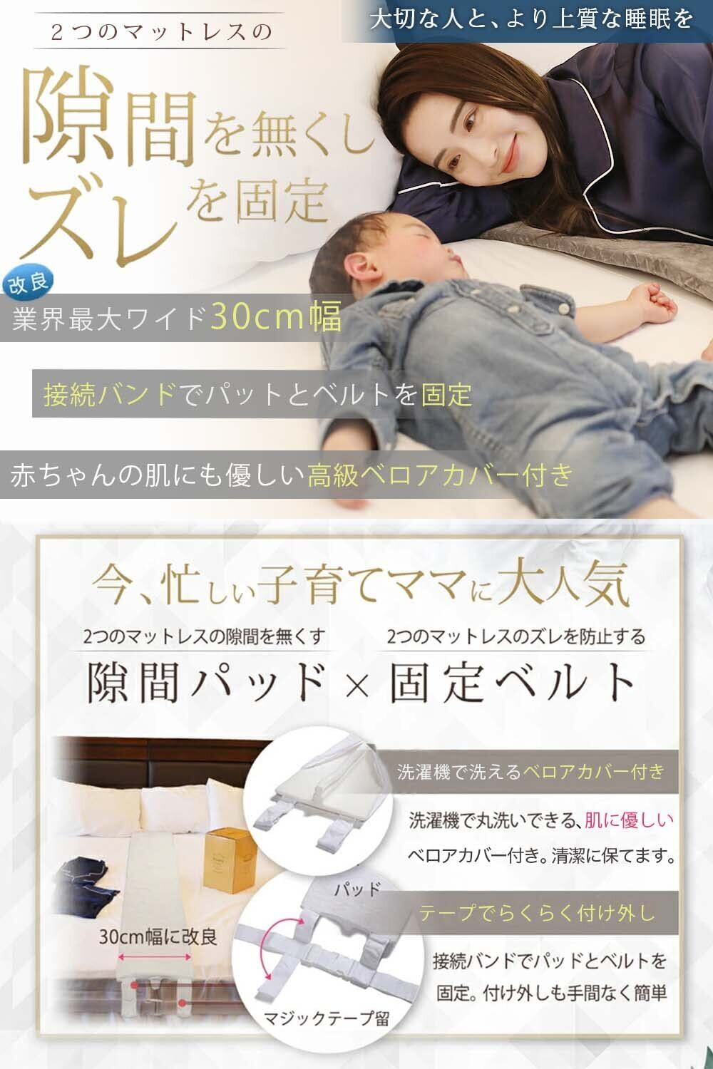 【新春セール】【マタニティ雑誌掲載】kurevy ベッド 隙間パッド パッド幅30cm すきまパッド 高級ベロアカバー付き マットレスバンド ベッドパッド マットレス 隙間スペーサー 隙間埋め 連結 固定ベルト10m 日本語取付説明書付き 日本メーカー国内検品済(30cmホワイト 洗濯カバー付き)
