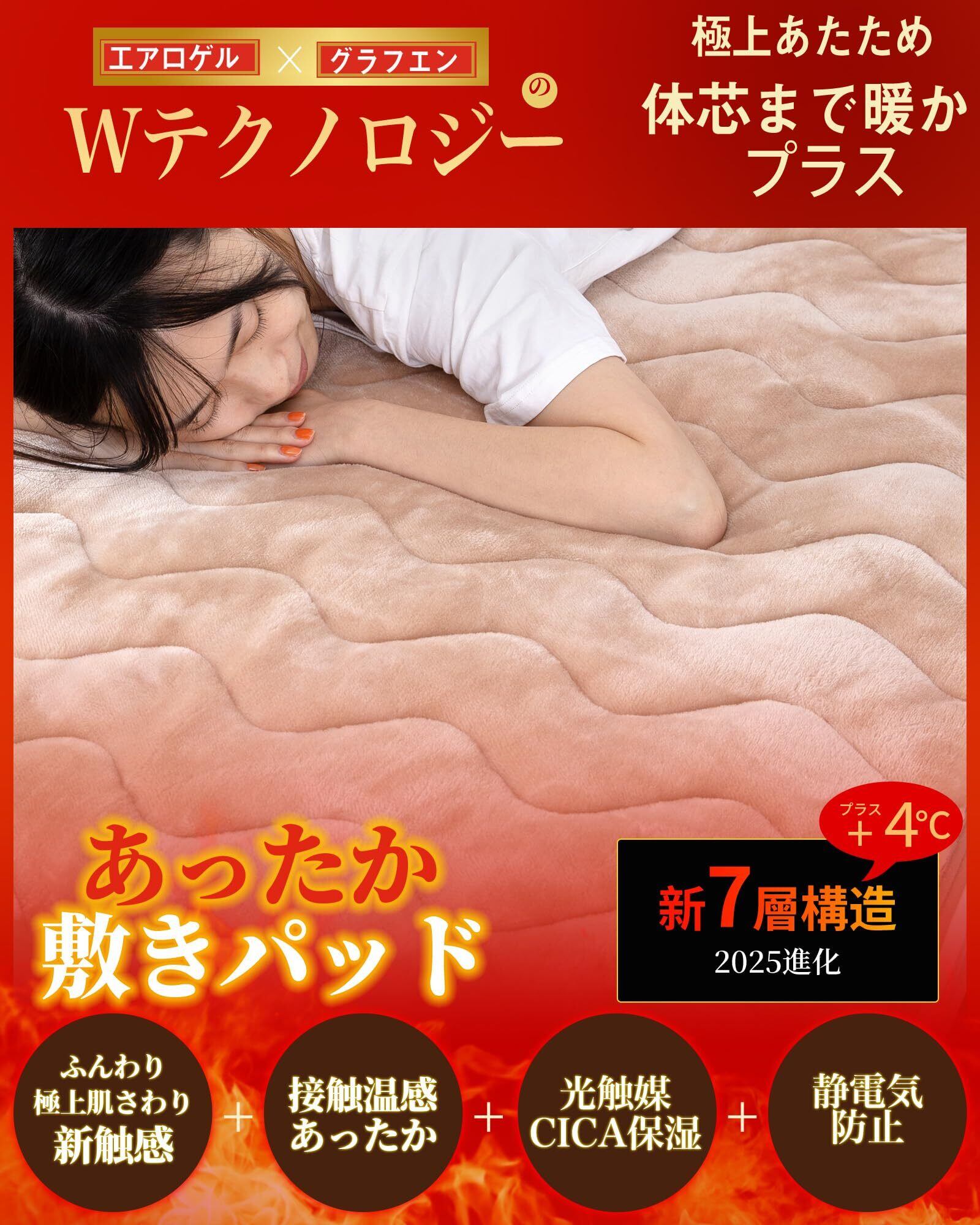 【温もりと快適さを実現するテクノロジー冬用敷きパッド】 宇宙技術「エアロゲル」は厚さ2mmで-196℃の極寒を遮断する超軽量断熱材。無数の微細な空気層が外気を遮りつつ内部の熱を保ち、洗濯を100回繰り返してもその保温性能は持続します。一方、ノーベル賞素材「グラフェン」は銅の10倍の熱伝導率を誇り、人体の熱エネルギーを遠赤外線へと変換し、深部から温めます。この二大素材が相乗効果を発揮することで、軽量性・断熱性・通気性を極限まで高め、これまでにない持続的な保温性を実現しました。冷え性対策や厳寒地でも対応できる性能を備えています。