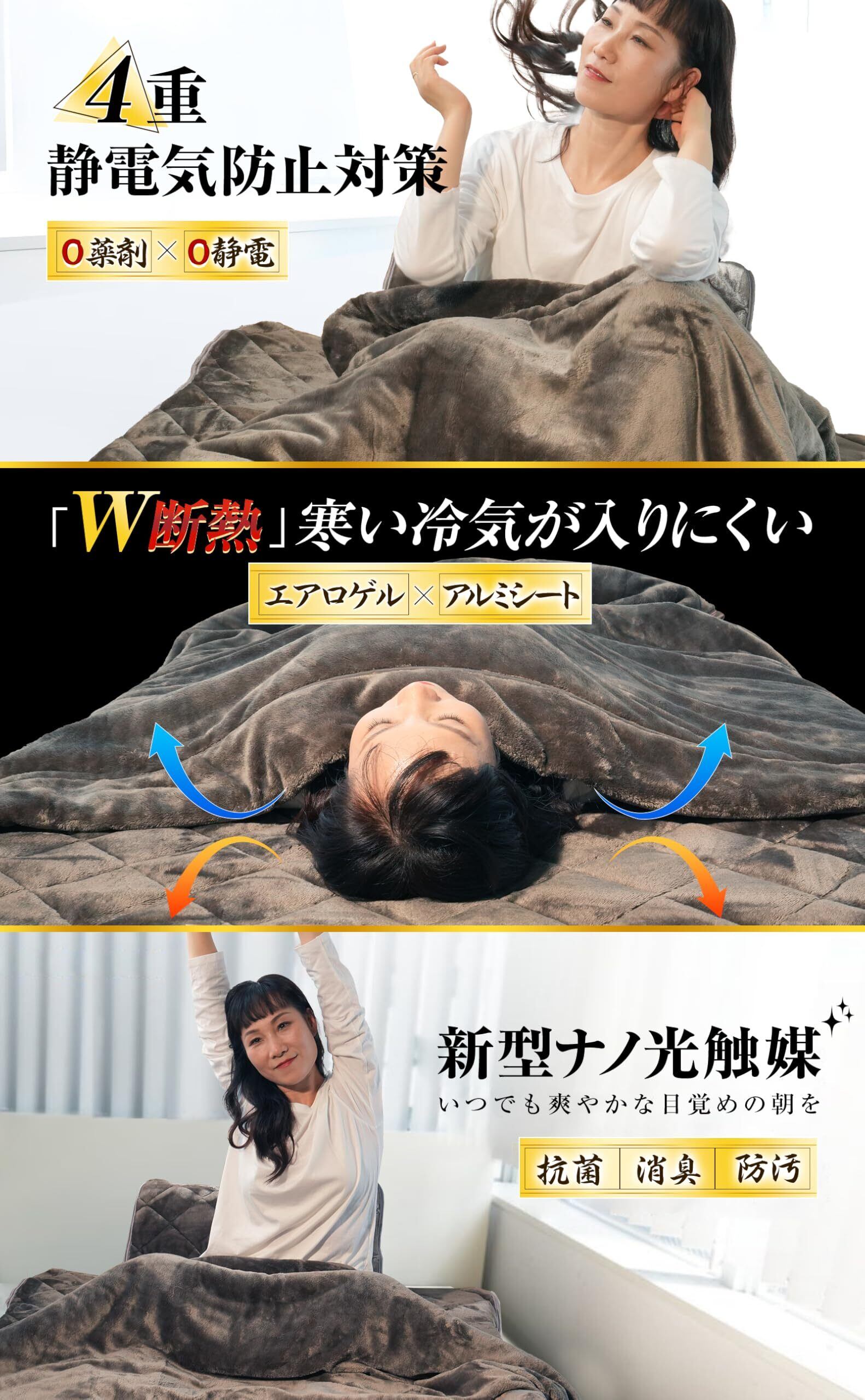 特徴 四重静電気防止【高機能導電糸】, 極上タッチ【最上位フランネル】, 極上暖感【吸湿発熱・W超断熱保温】, 極上睡眠【安眠・快眠】, 美容睡眠【CICA保湿・美肌】