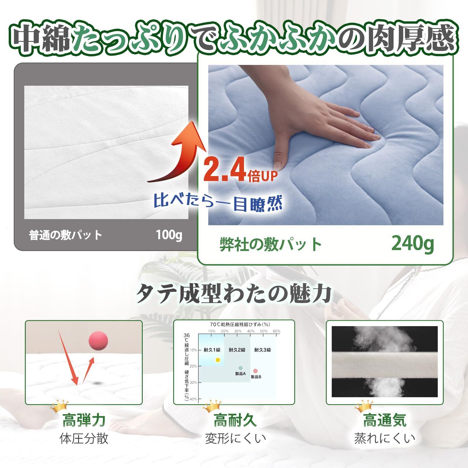 【こだわり五層構造】①表地:柔らかい水晶(すいしょう)マイクロ生地。②綿吹き出し防止不織布中わた③『帝人TEIJINフレッシュコールZ』4大消臭・防ダニわた。④厚さ1cmの『タテ成型わた』使用、体圧を分散、疲れを軽減。⑤裏地:吸水速乾・通気性優れニットワッフル。