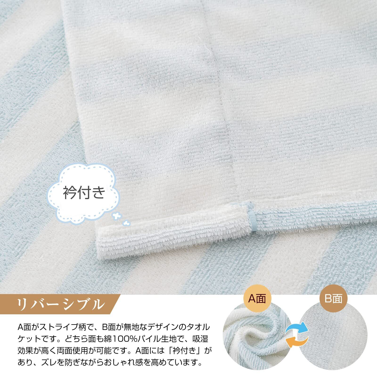 【吸湿通気性・リバシーブル】 両面が使えるやさしい肌触りのタオルケットです。パイルは綿100%で、吸水性が良いので寝ている間の汗や湿気を吸ってさらさらに保ちます。なめらかでしっかりしたボリュームと通気性があります。両面は異なるスタイルです。A面が縞柄(衿付きあり)で、B面が白い無地のタオル地です。シンプルなスタイルで、和室にも洋室にもぴったりです。お好みに合わせて、好きな面をお選びください。※両面を貼り合わせる必要があるため、特殊加工で仕上がりは少し硬いかもしれませんが、1回洗濯するとふんわり感が戻ってきます。