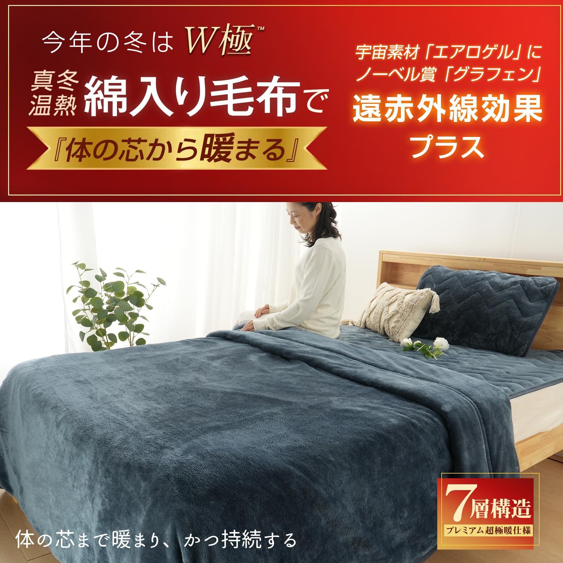 【体温を効率よく循環させる新6層温熱キープ構造】W極暖かい毛布は『ニューマイヤ毛布➡高機能抗菌防臭中わた(抗菌防臭防ダニ層)➡グラフェン入りわた(発熱層1)+アクリレート吸湿発熱わた(発熱層2)➡エアロゲル入りわた(超断熱保温層1)➡アルミ蒸着加工(断熱反射熱2)➡ニューマイヤ毛布』の新6層温熱キープ構造でW極独自の暖かさを作り出します。体温を蓄えて発熱しながらアエロゲルとアルミ蒸着のダブル断熱パワーで体温を逃がさず、反射熱として跳ね返します。外気からの冷気も反射するため、朝までぽかぽか、ぐっすり快眠。