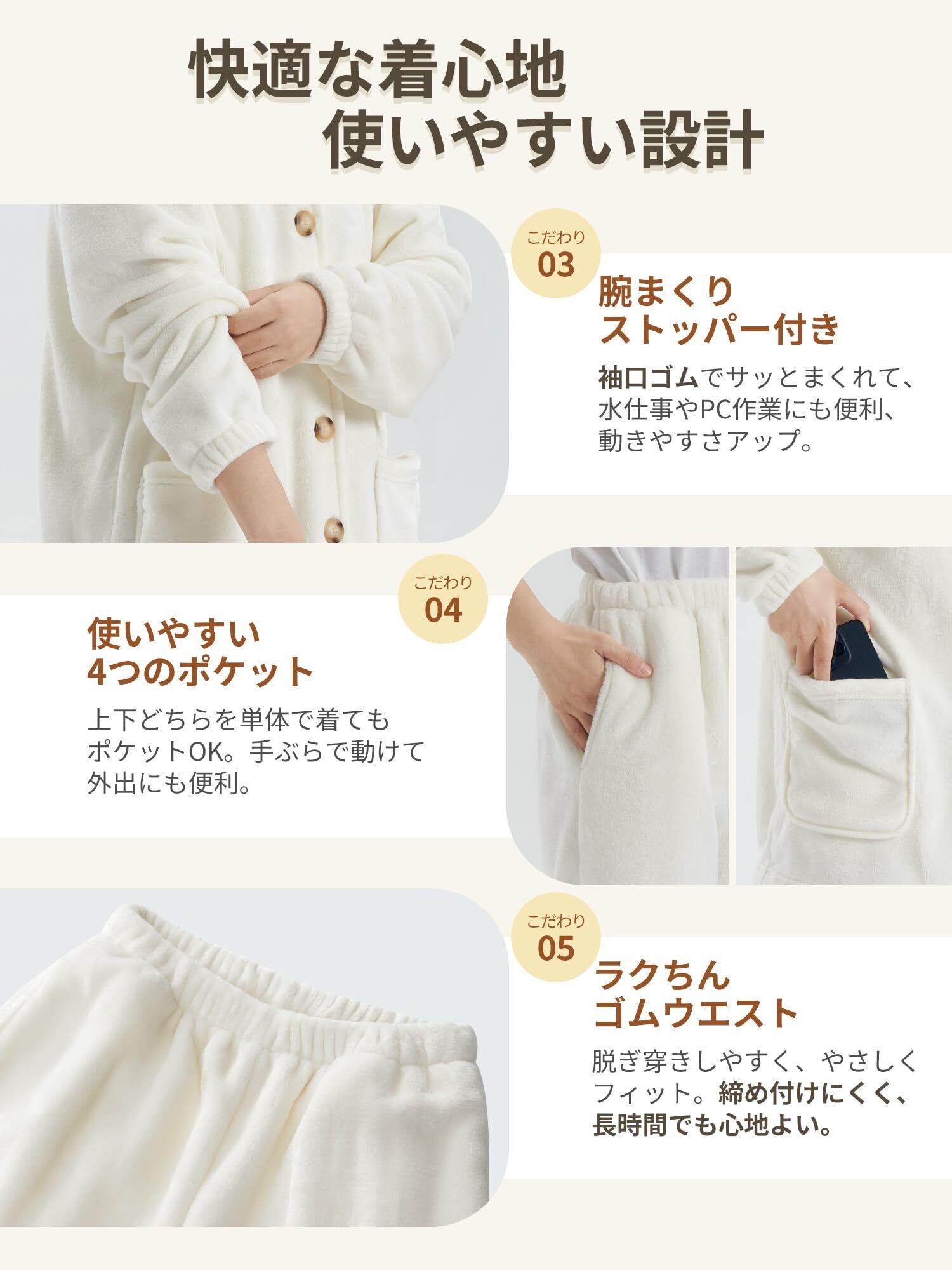 [クモリ] 冬 着る毛布 上下セット L ユニセックス 暖かい 男女兼用 フランネル ふわふわ 前開き ポケット付き ボタン付き ハイネック リブ袖 吸湿発熱 静電気対策 丸洗える ルームウェア 部屋着 あったか レディース メンズ 軽量 防寒 保温 パジャマ L アイボリー