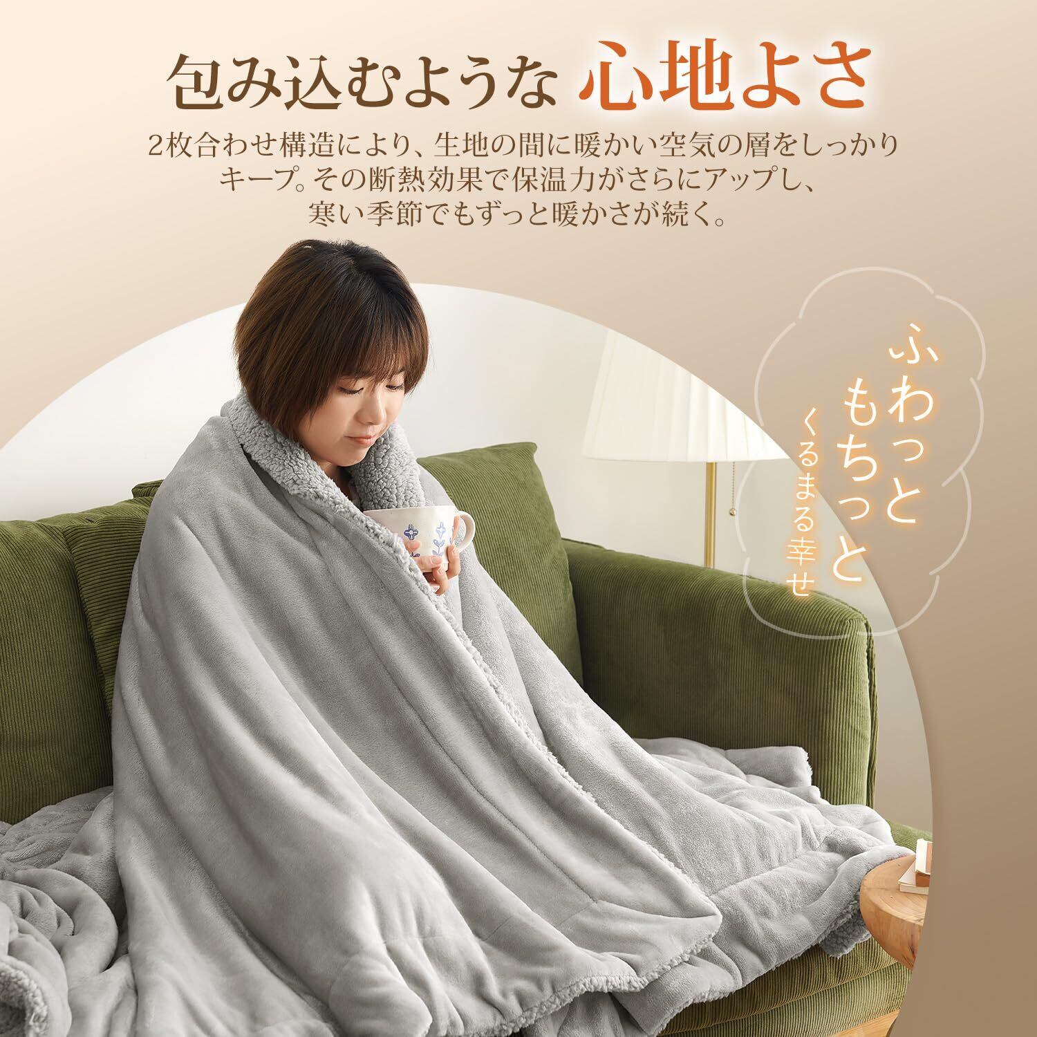 2枚合わせにすることで毛布にボリューム感が生まれ、ふっくらとした仕上がりになります。さらに、2枚の毛布の間に空気の層ができるため、空気の断熱効果により保温力がアップし、しっかり暖かくなります。