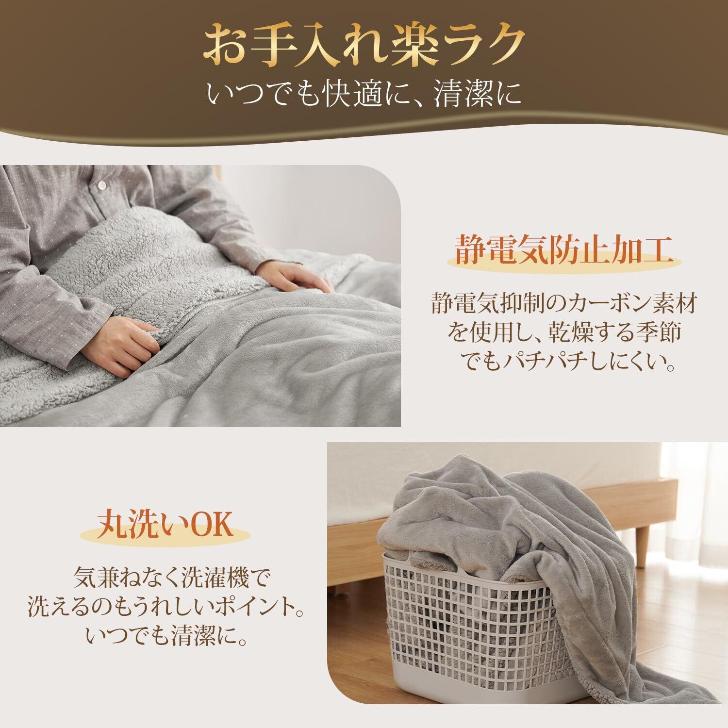 【静電気軽減】 冬に起こりやすいイヤなパチパチ。静電気が起こると寝具にもホコリが付きやすくなったりいいことなし。快適にお休みいただけるように製造段階で静電気防止加工を施しております。