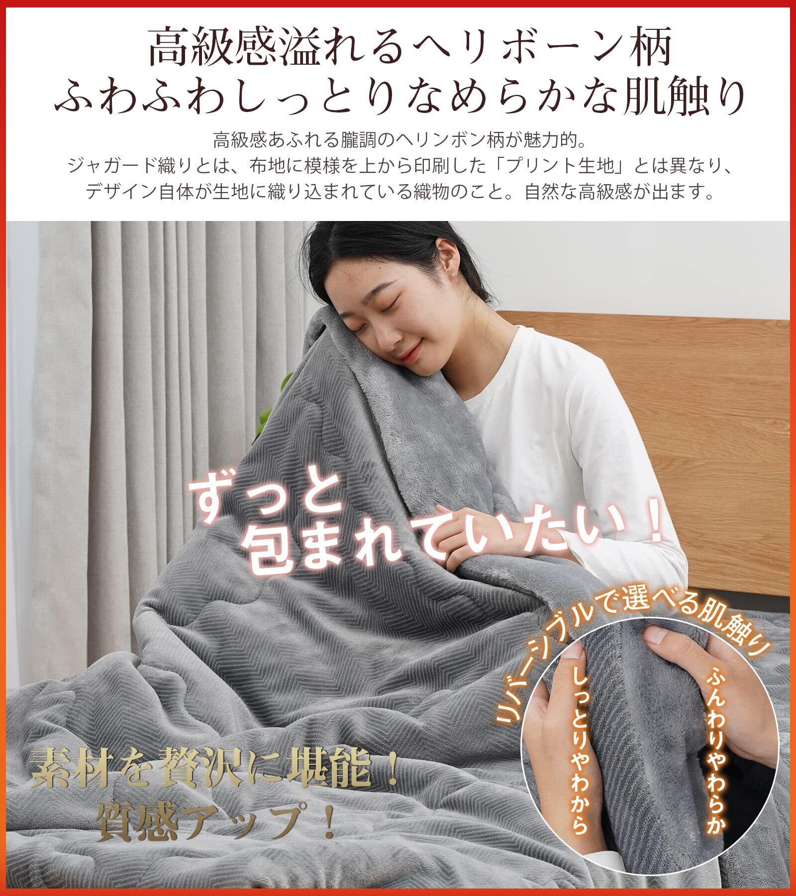 【暖かさの秘密は:超高密度マイクロファイバー繊維】冬の乾燥ケアもする癒しの暖かい毛布の表地には、日本伝統の起毛技術を施した高密度フランネルを採用しています。髪の毛の1/100以下という超極細繊維を絶妙に織り込むことで、しっとりなめらかで非常に柔らかい、極上の肌触りを実現しました。マイクロファイバーは繊維密度が高いため空気を通しにくく、冬用毛布として、暖かさを最大限に保ち、熱度を逃がしません。【素材を贅沢に堪能!質感アップ!ソフトでなめらかな肌ざわり】:高級感あふれるヘリンボーン柄が魅力の一つで、手でなでると生地の表情に変化が出て何度も触りたくなることでしょう。高密度フランネルとCICA保湿加工による極上肌触りで、CICA配合により睡眠中の潤いをキープし、冬の乾燥からお肌を守ります。