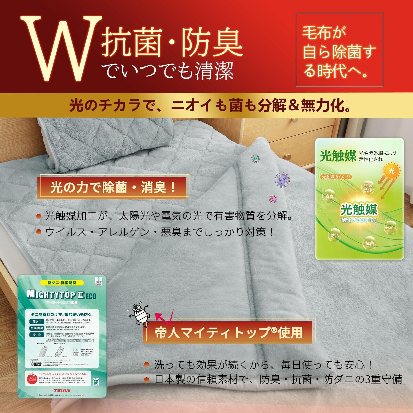 【ブランケット表面は「光触媒除菌加工」×「超高密度繊維」】光(太陽光・LEDなど)を浴びるだけで、繊維表面に吸着した菌・アレルゲン・臭い・ウイルスを分解・除去する「可視光応答型光触媒」を採用。一般的な抗菌・防臭加工とは異なり、薬剤を一切使用せず、お子様・ペット・アレルギー体質の方にも安心安全。当社の光触媒は「粉状二酸化チタン」ではなく「薄膜型ナノレベル成膜技術」を使用し、1000回使用でも効果が持続(第三者試験済)。従来のコーティング系除菌加工とは徹底的区別した“新世代清潔機能”です。