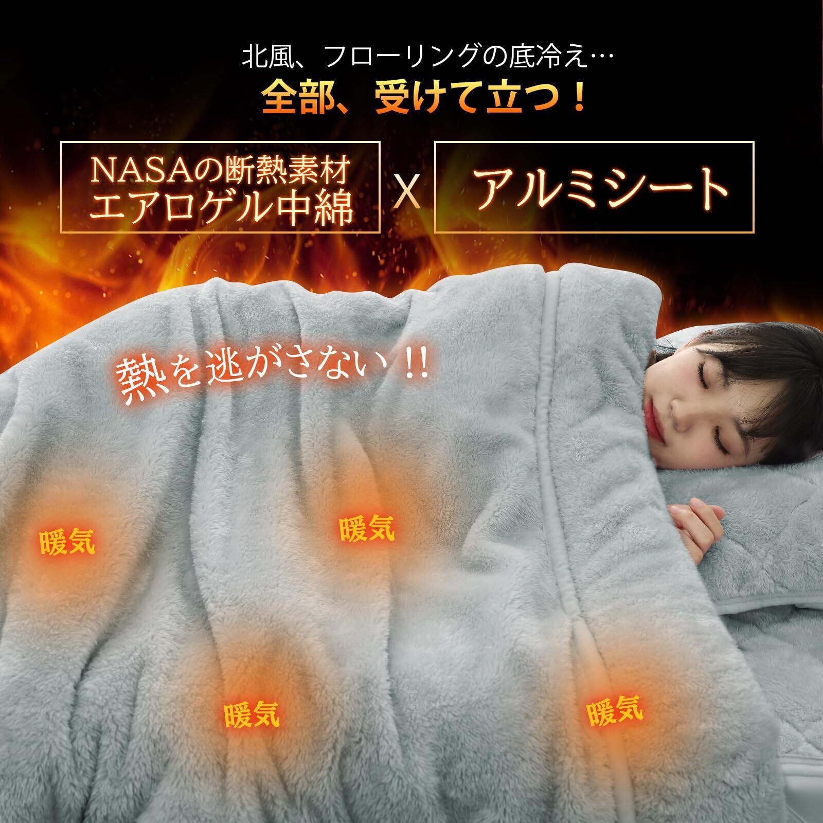 【世界初※!4種類の高機能中綿を融合した、超断熱・超蓄熱構造】断熱性能に優れるNASA由来のエアロゲル中綿を中心に、吸湿発熱中綿・蓄熱保温中綿・抗菌防臭中綿4種の機能中綿を贅沢にサンド。さらにアルミシートも使てます。この独自の多層構造技術で毛布1枚に凝縮することで、電気使わずにまるで“電気毛布”のようなぬくもりが実現。寒冷地やエアコン節電派にも最適な、業界トップクラスの保温力。