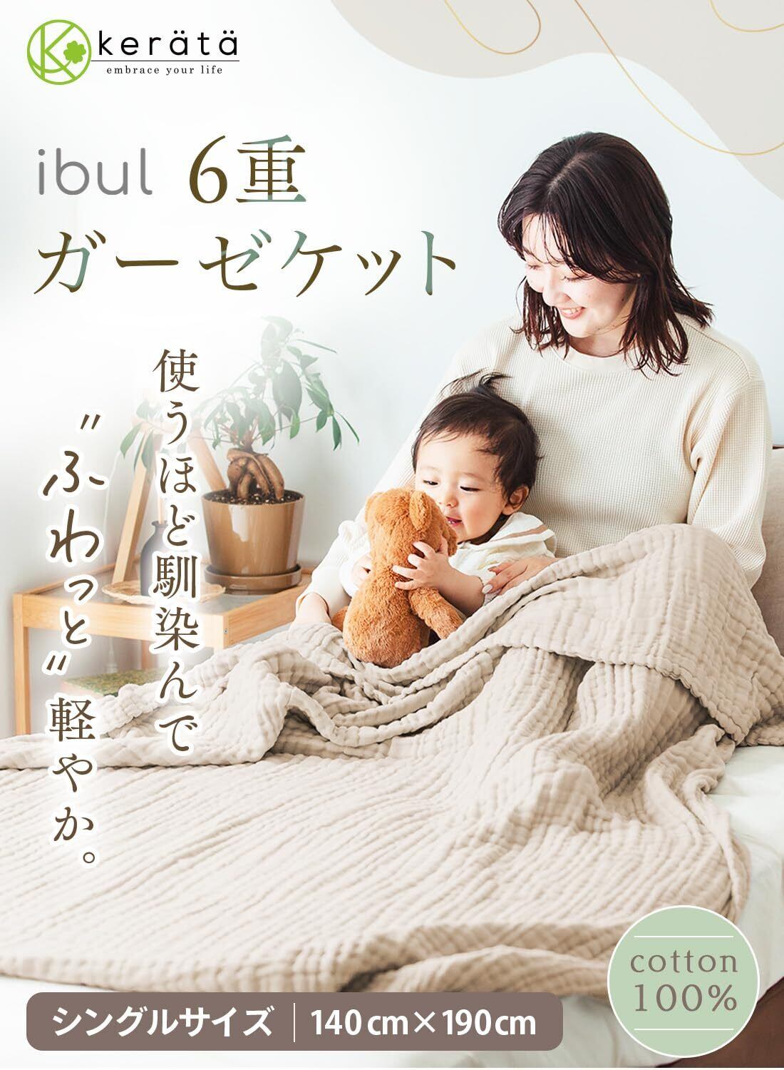 (ケラッタ) イブル 6重 ガーゼケット シングル 【夢心地なもこもこガーゼ】 春 夏 夏用 ガーゼ タオルケット ブランケット 綿100% ひざかけ 140×190㎝ (ベージュ)