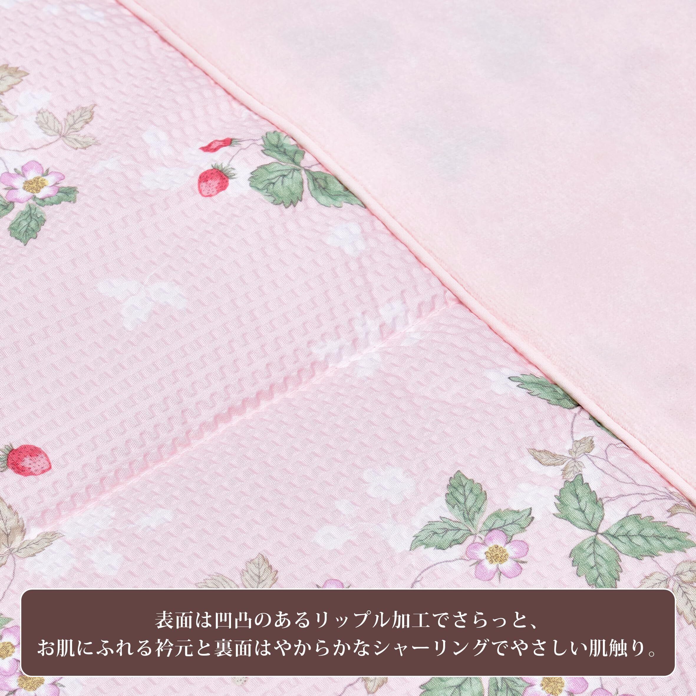表面は凹凸のあるリップル加工でさらっと、お肌に触れる衿元と裏面はやわらかなシャーリング地でやさしい肌触りです。