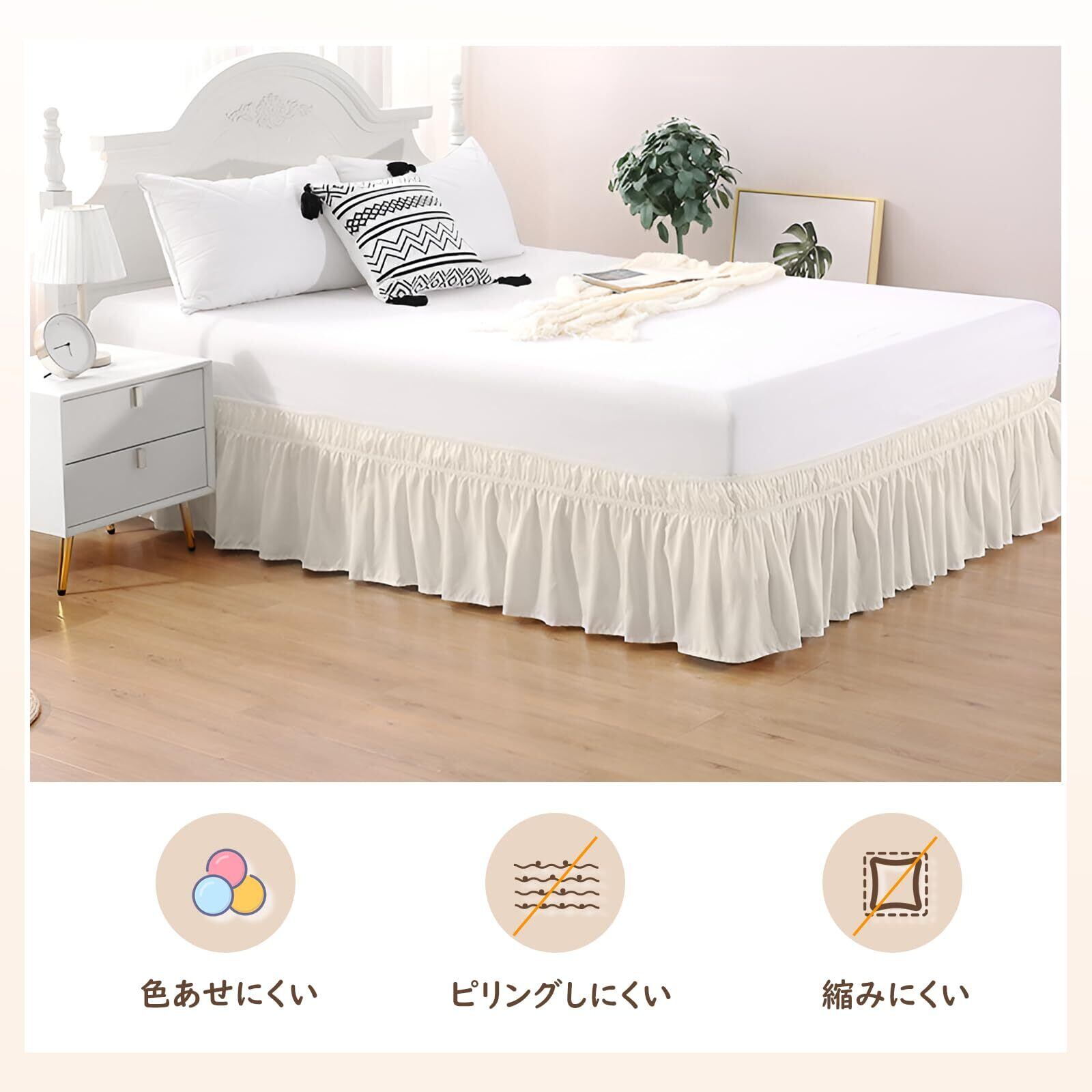 【フリル付き】:エレガントなフリルが全体を包み、高級感とおしゃれさを同時に演出するベッドスカートです。