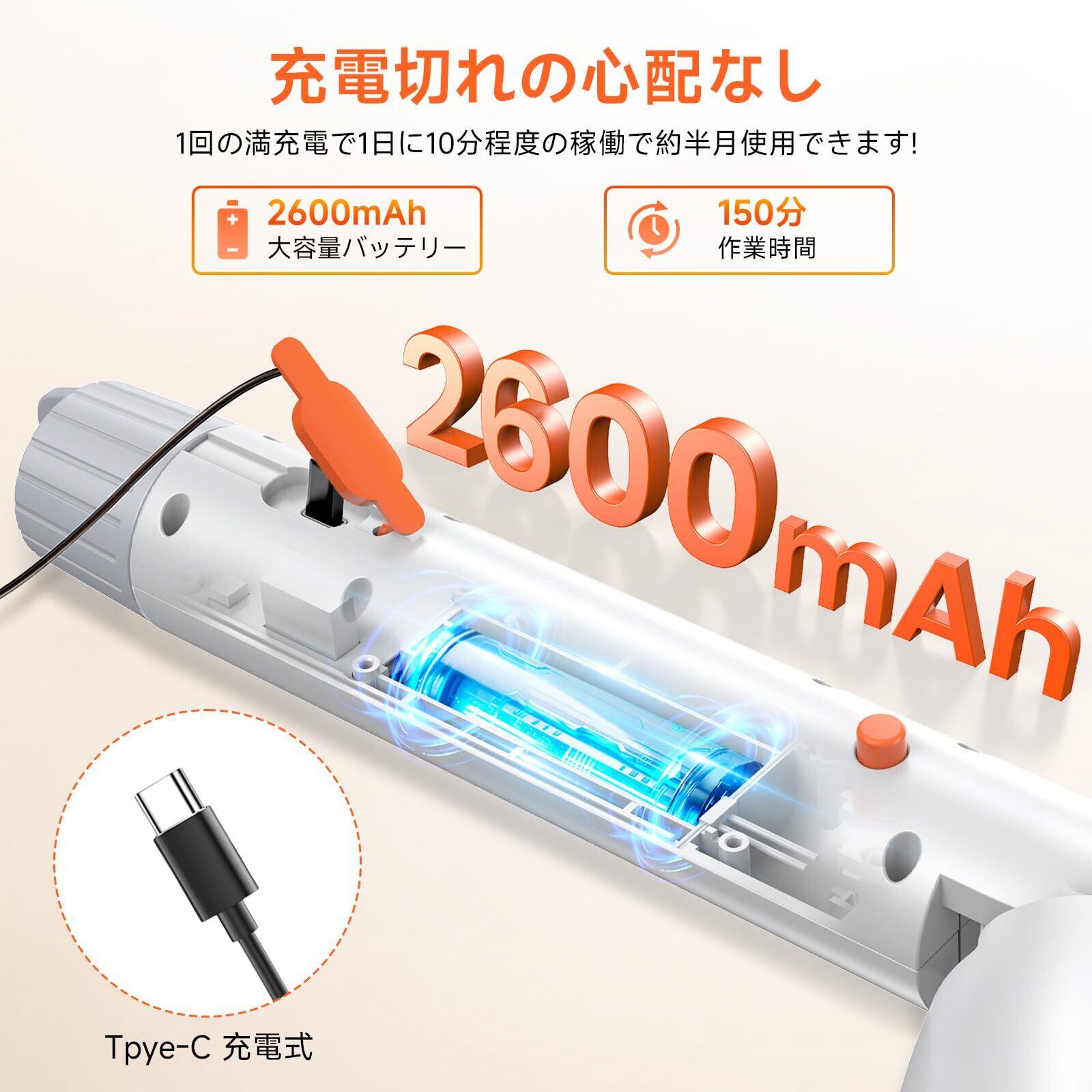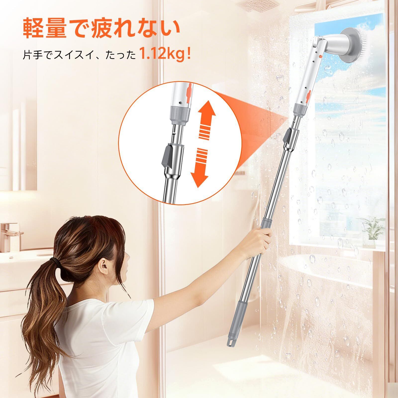 【伸縮ポール&コードレス設計】立ったままラクに家中お掃除 伸縮ポール付きで、かがまずに立ったまま床・壁・天井・浴槽裏までしっかり届きます。コードレス設計なので、電源コードの煩わしさがなく、浴室電動ブラシとしても家中どこでも快適に使用可能。腰や膝への負担を軽減し、大掃除でも疲れにくい設計です。