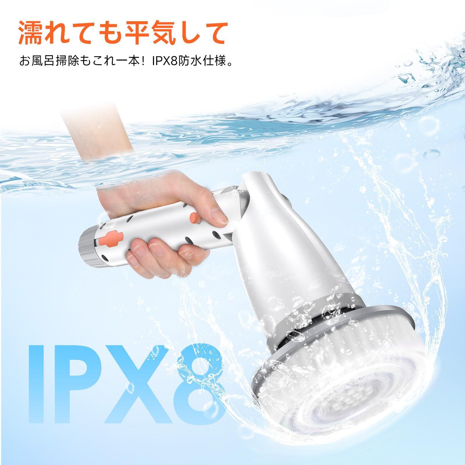 【全身防水IPX8】浴室でも安心して使える水洗いOKモデル IPX8完全防水設計で、浴室や濡れた場所でも安心して利用できます。使用後はブラシ部分を丸洗いでき、常に清潔な状態をキープ。風呂掃除 電動ブラシ、キッチン用クリーナー、ベランダ掃除ブラシとしても使える、多用途で衛生的なクリーニングツールです。