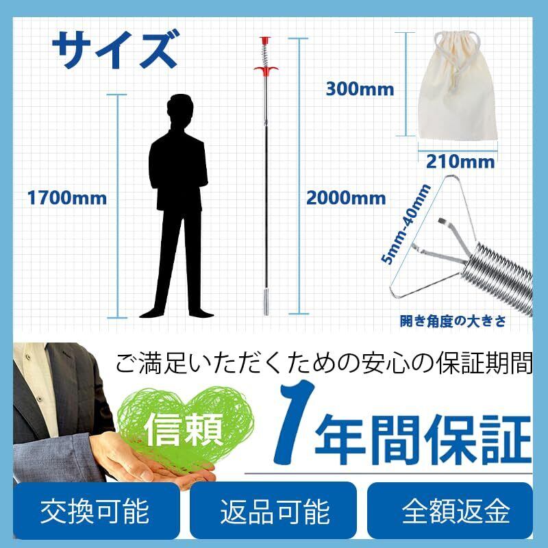【セット内容】パイプクリーナー*1点、収納袋*1点のセットです。排水管内の異物回収や日常的な軽い清掃作業に使いやすく、使用後もまとめて清潔に保管できます。
