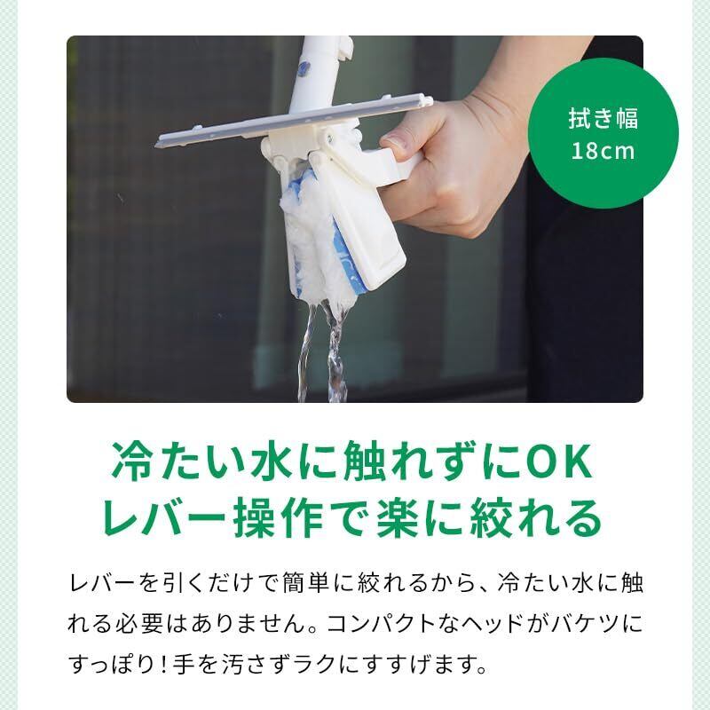 【手を汚さずお掃除】拭き幅は約18cm。他の窓用ワイパーに比べて小さ目ですが、その分フィット性がいいので均一にお掃除できます。また、通常の丸型バケツに入るサイズなので、モップの洗浄も簡単にできます。 絞りレバーを引き下げるだけでモップのスミまで手を汚さず一気に絞れます。