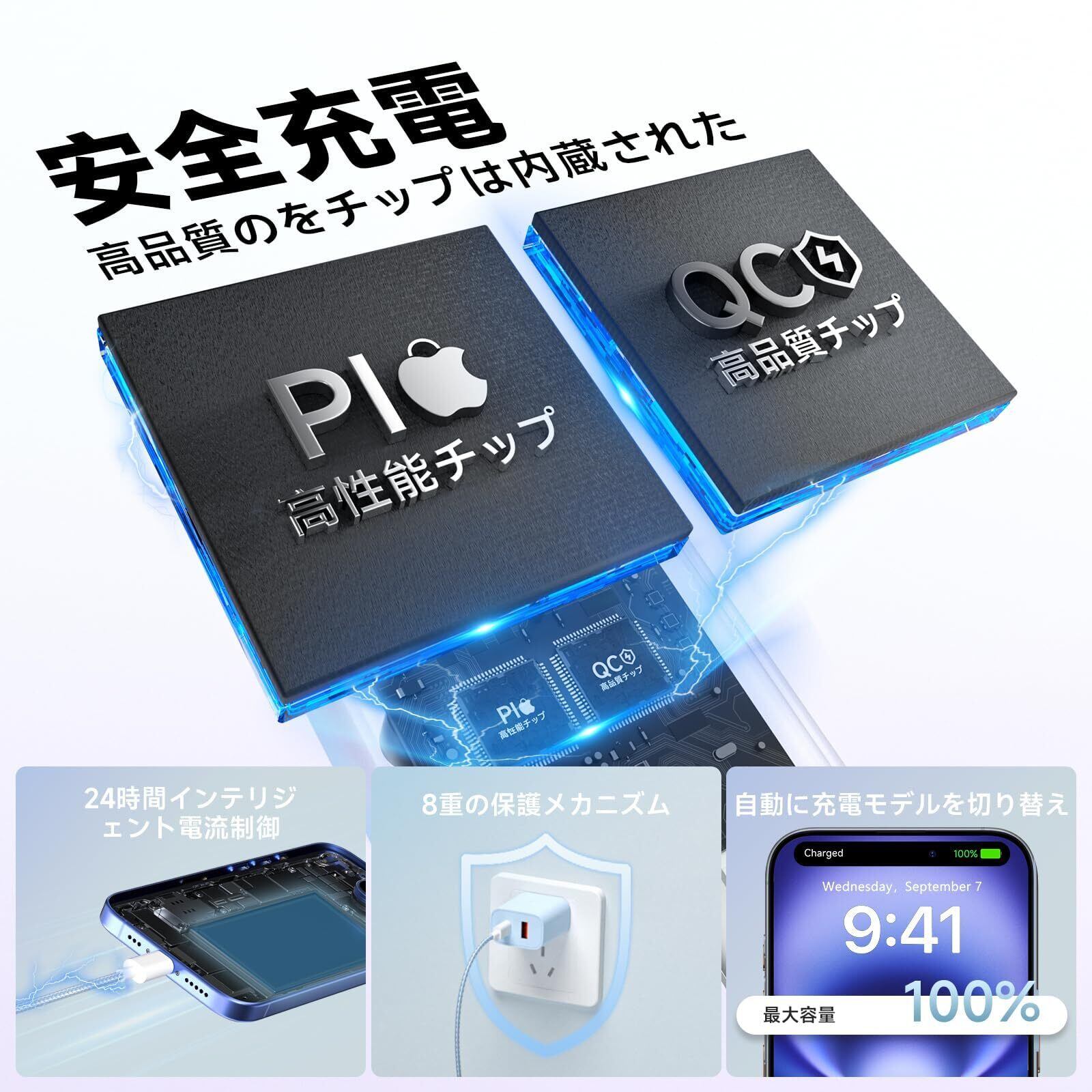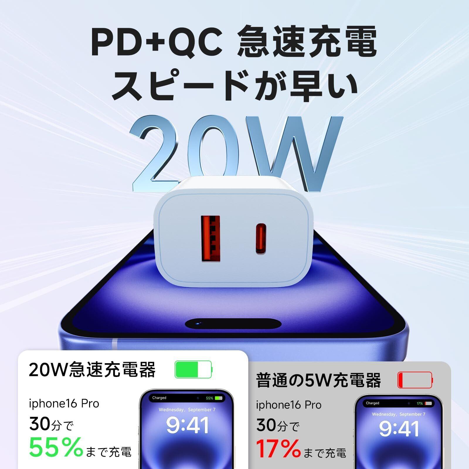 【PD20W-iphone17/16/15超高速充電器】のPD 20W急速充電器はPower Delivery規格に対応しており, QC3.0 USB-C電源アダプタは最大出力が20Wでき、For iPhone 15なら、ただ30分間で50%にも充電でき、従来品の充電器より、充電スピードが大幅にアップされました。