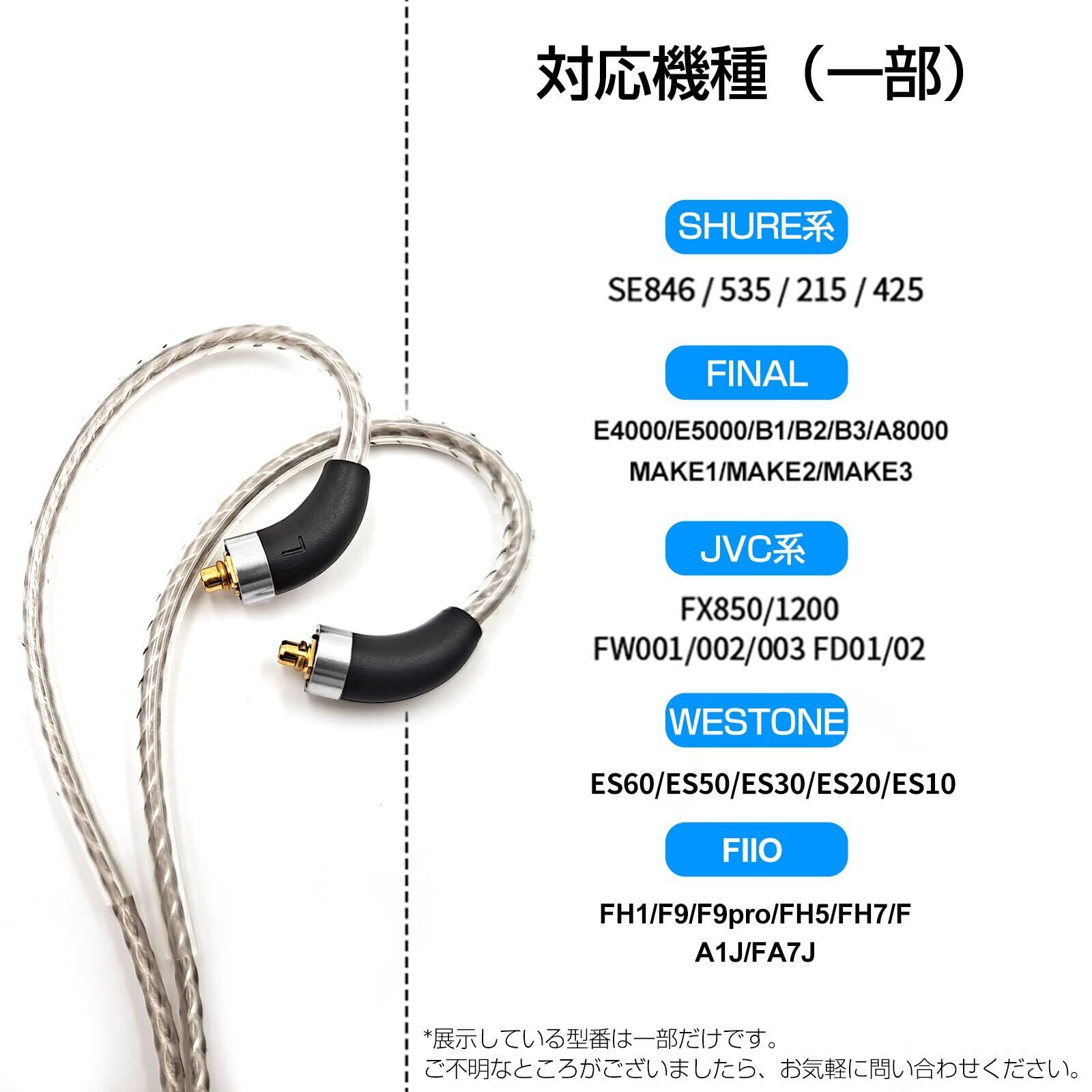 「 対応機種(一部)」SHURE系:SE215/SE425/SE535/SE846/SE315等。final系:E4000/E5000/B1/B2/B3/A8000/MAKE1/MAKE2/MAKE3等。fiio系:FH1/F9/F9pro/FH5/FH7/FA1J/FA7J等。JVC系:FX80/1200/FW001/002/003/FD01/02等。WESTONE系:ES60/ES50/ES30/ES20/ES10等。Byerdanamic:XELENTO等。以上のイヤホンと互換性があります。また他型番ご不明なところがございましたら、お気軽に問い合わせください。