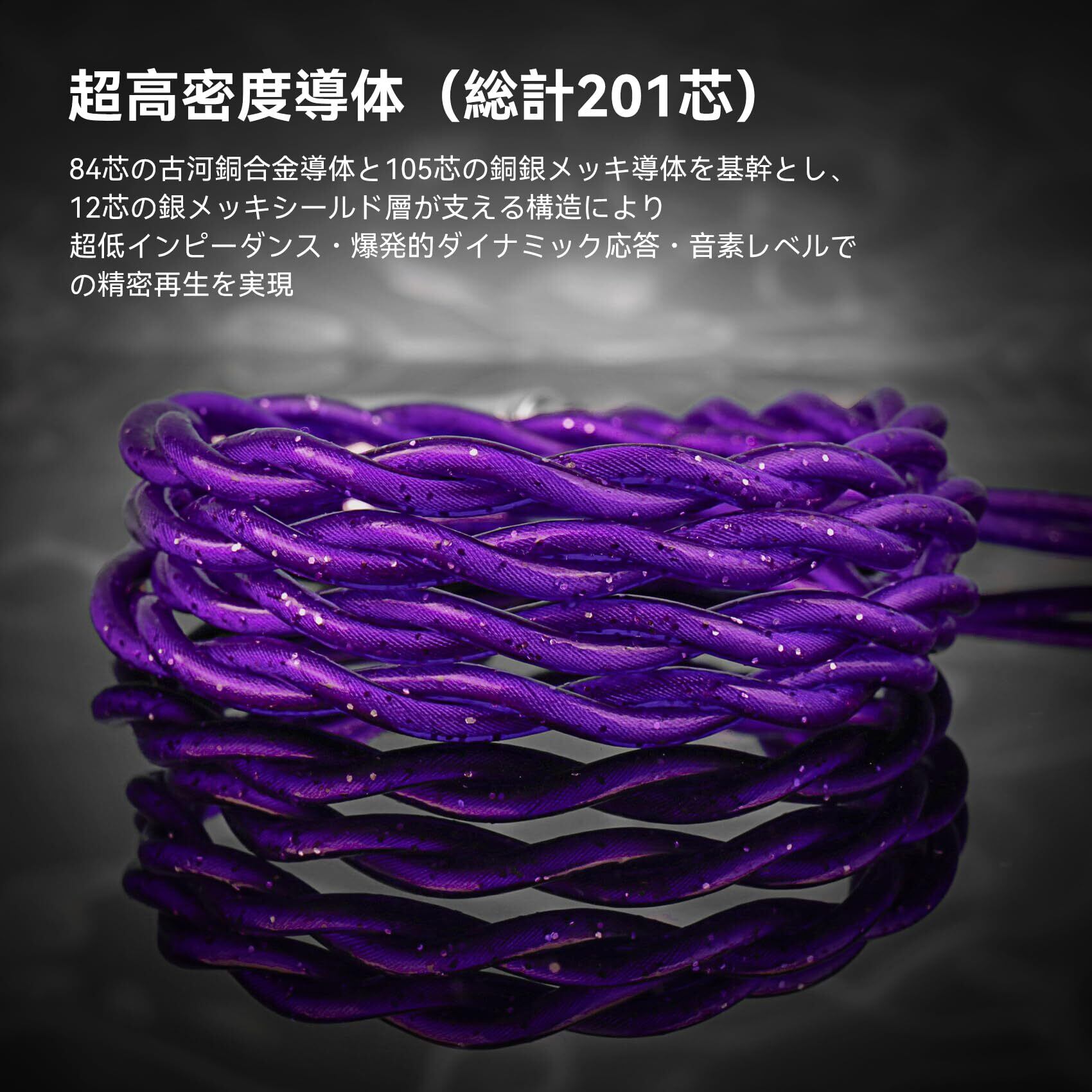 【201芯多層混編、伝導と解像度を両立してアップグレード】 紫霄 イヤホン リケーブルは84芯の古河銅合金、105芯の銅メッキ銀導体を採用し、12芯の銀メッキシールド層を補助として、合計201芯の超高導体数により、インピーダンスを効果的に低減し、ダイナミックレスポンスの敏速さと音の細部の正確な再現を確保しています。高密度の多芯編組技術は、干渉と絡みを抑制し、ケーブルの柔軟性と耐久性を向上させるだけでなく、音の細部とダイナミックを完全に伝達し、旋律の一つ一つをはっきりと表現します。