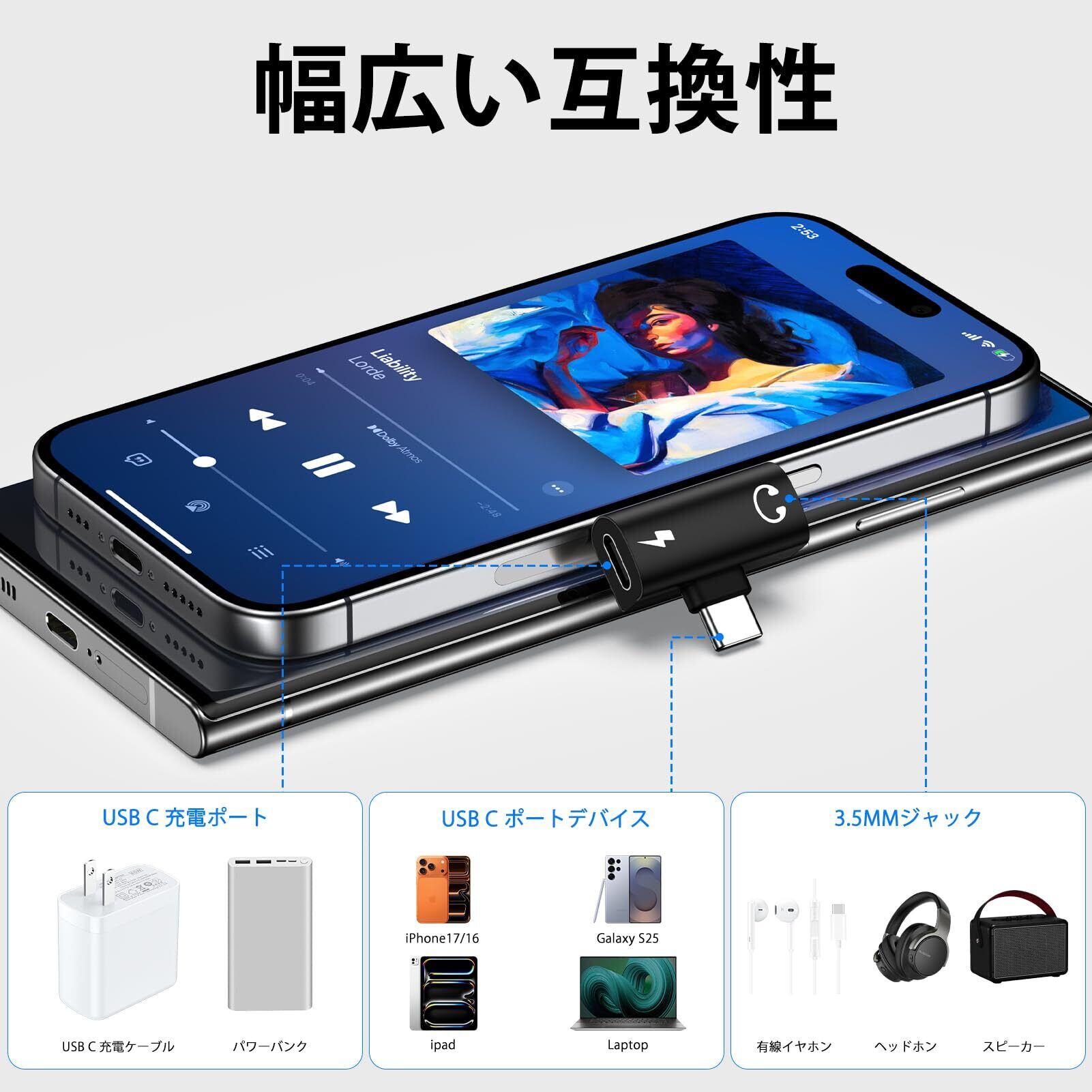 【高音質DAC搭載・多機能】タイプC イヤホンジャック 変換は16bit/48kHz対応の高性能DACチップを内蔵し、雑音を抑えた高忠実なオーディオジャック出力を実現。音楽・映画・ゲームなどの場面で没入感あるサウンド体験が可能。インラインコントロールに対応しており、音楽の再生/停止や音量調節が可能で、とても便利です。マイク付きのイヤホンを使えば通話もできます。オーディオとマイクの両方の機能に対応しており、ゲーム、ナビゲーションにも便利になり、TRRSの3.5mmマイクでの使用にも特徴。T字型のデザインにより、充電しながらのゲームプレイを妨げず、ゲーム体験が向上します。