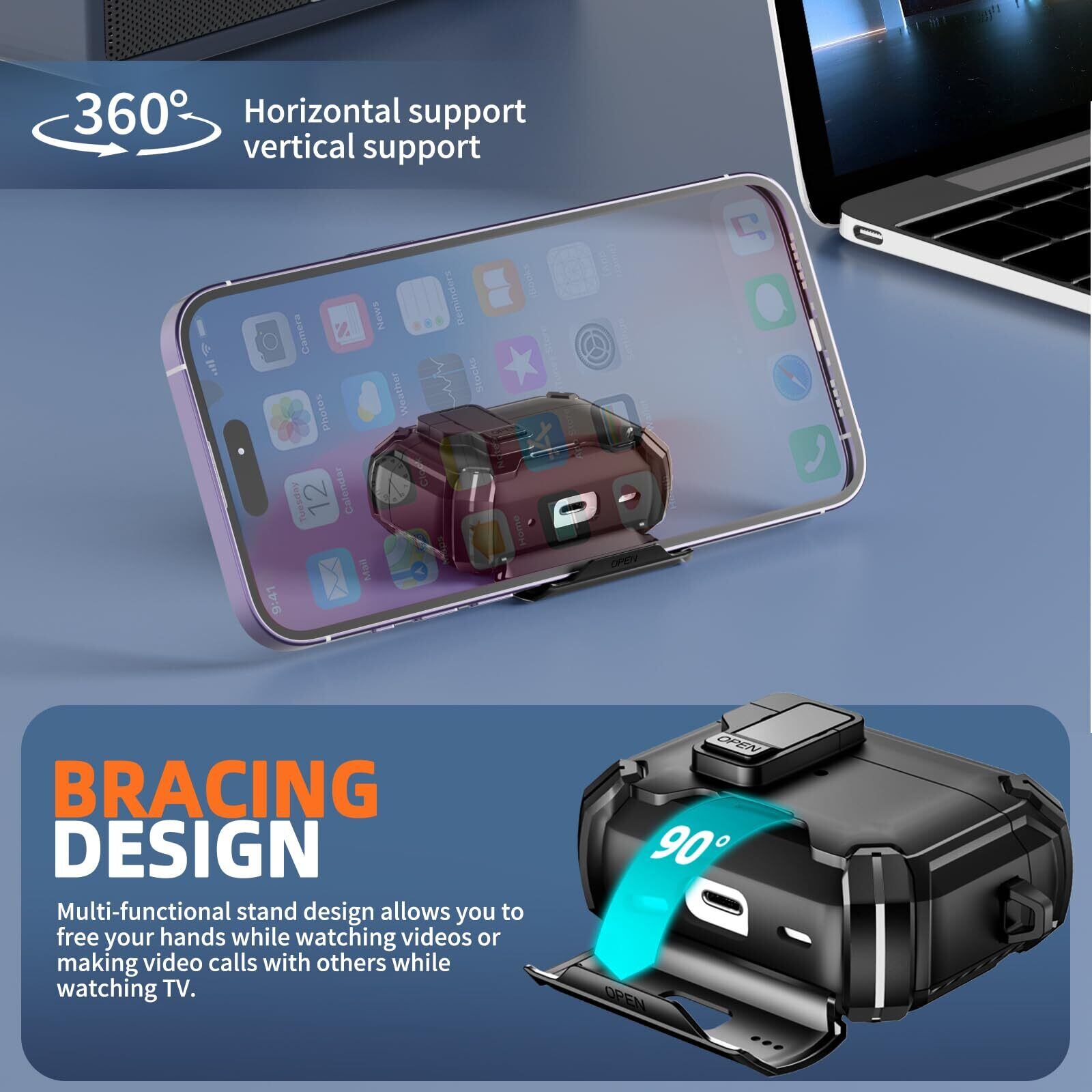 革新的なステント設計:新しいステント機能設計は、2つの実用的な機能を提供します。えあーぼっず プロ3 ケースのボトムカバーのスイッチ(OPEN)をオンにすると、携帯スタンドを使用して、両手を解放して携帯電話やビデオチャット、映画を見ることができます。携帯電話のホルダーをかぶせるとダストカバーになり、Airpods pro 3をホコリから守ることができます