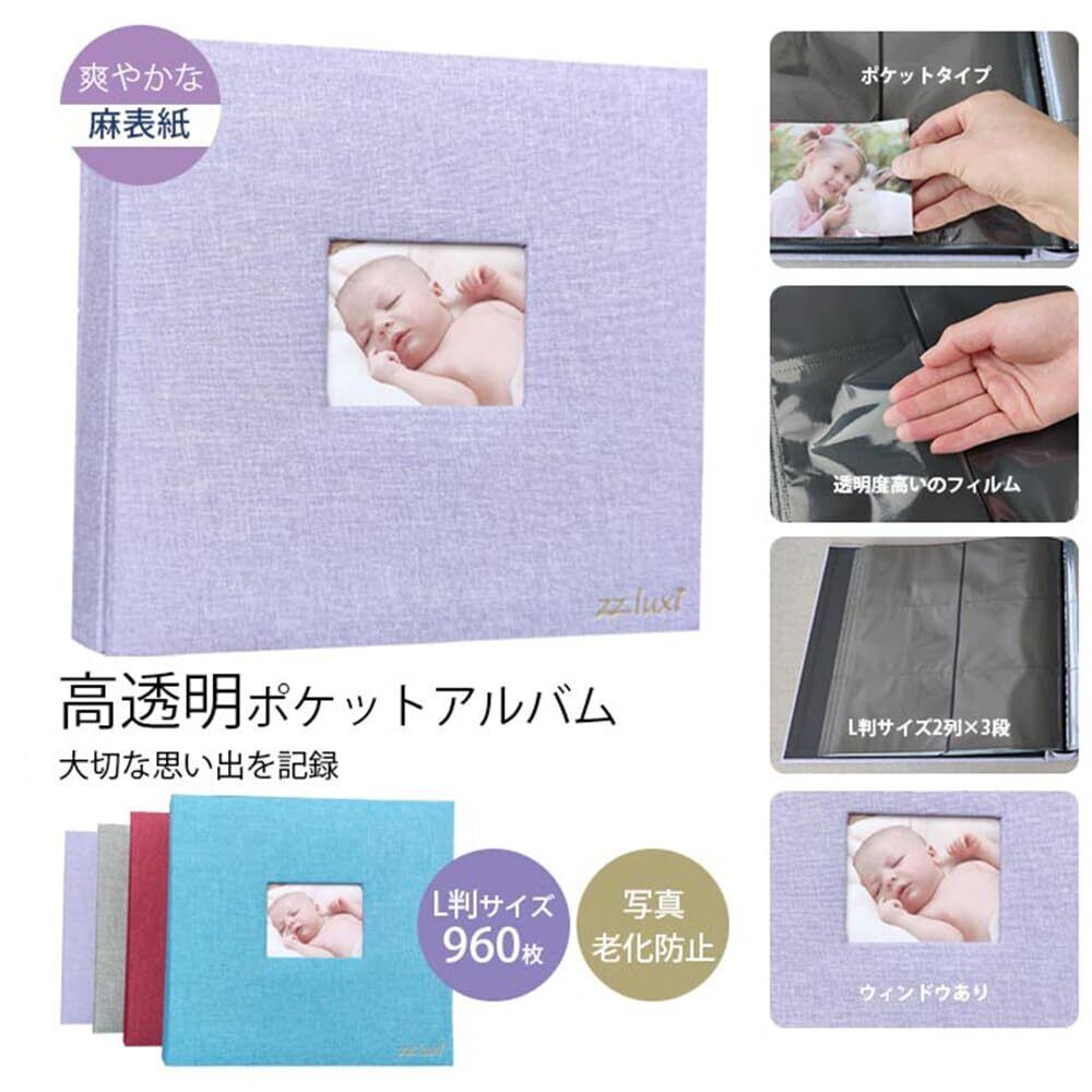 【960枚大容量アルバム】高透明ポケット収納タイプ、L判サイズ2列×3段、160ページ、縦310×横300×背幅72mm、大容量960枚収納 素材:麻表紙+ポリプロピレン